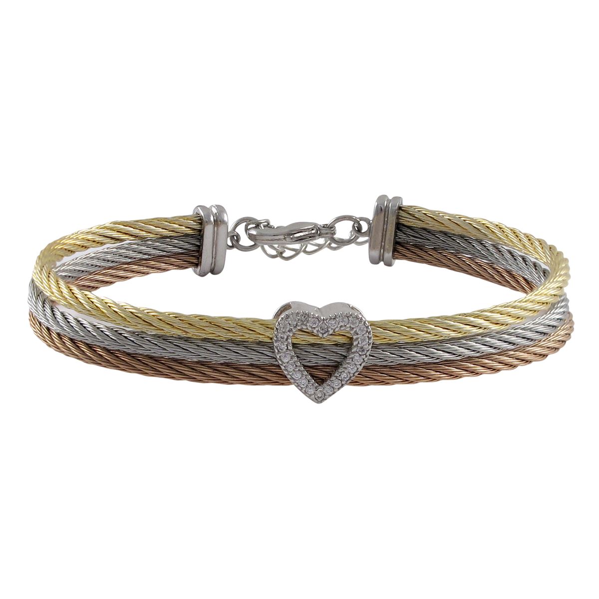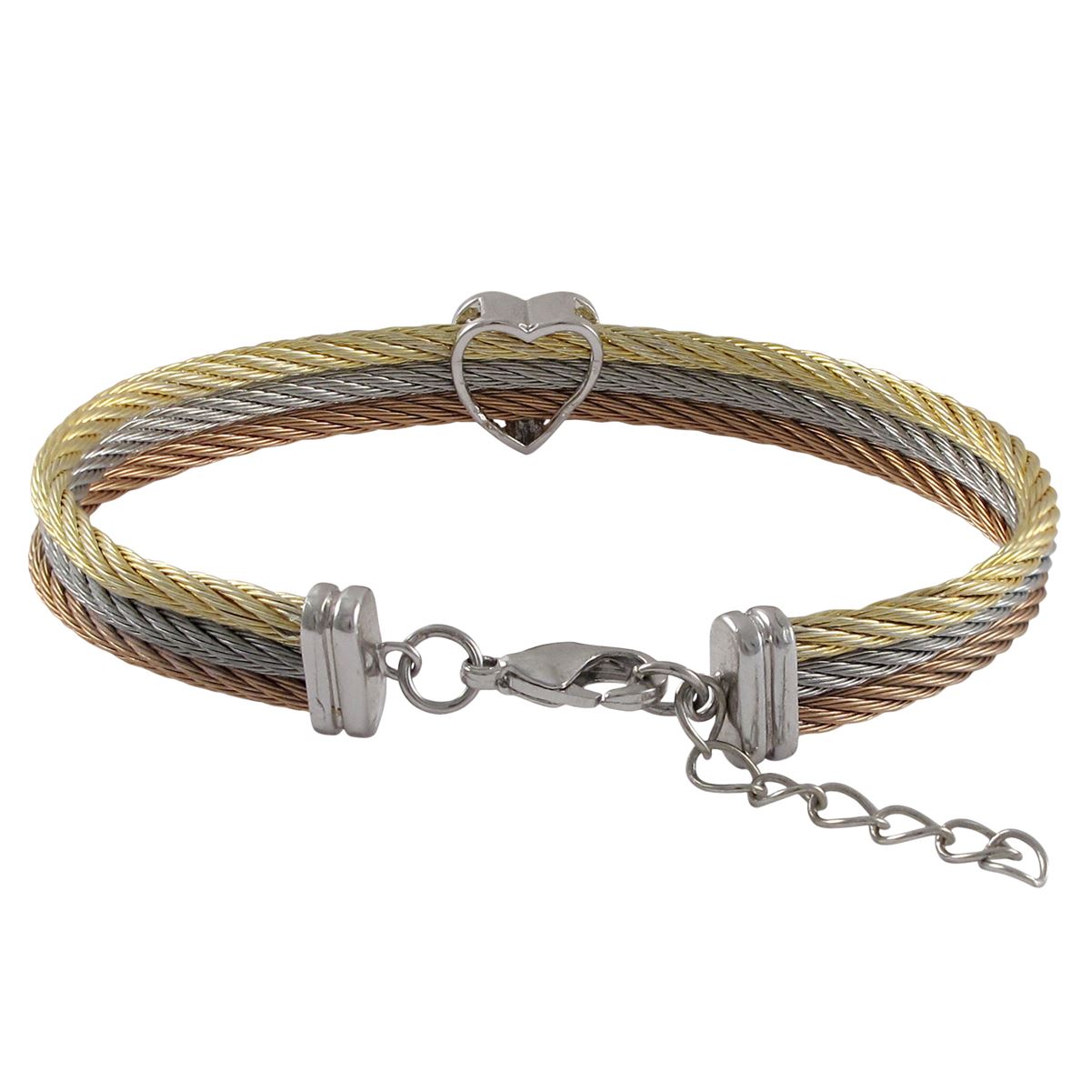Tri Color Stainless Steel Bangle With CZ Heart In Center. This Bangle Bracelet Measures Approx 55Mm With 1 Extender.