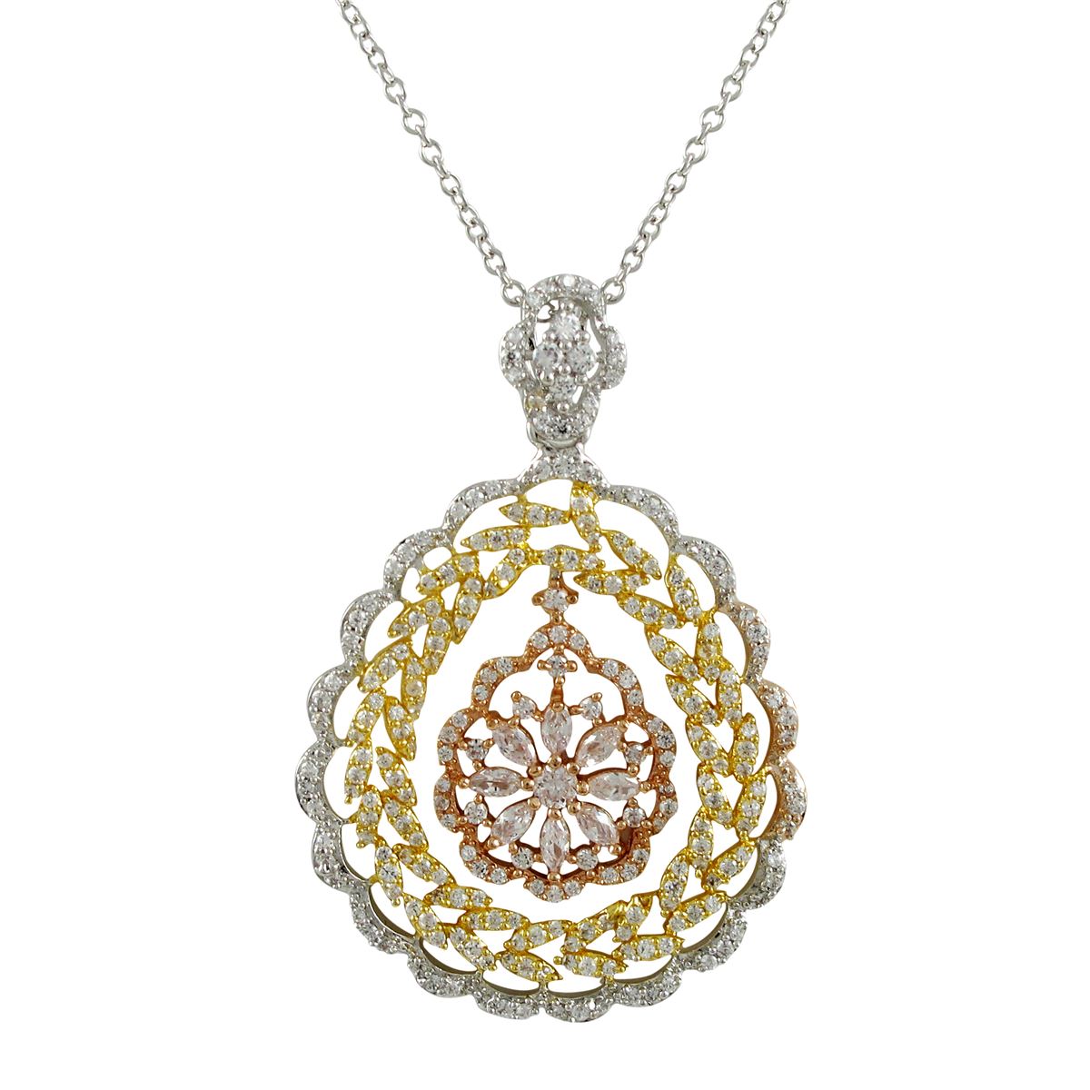 Tri Color Sterling Silver CZ Floral Wreath Design Pendant, 1.96"