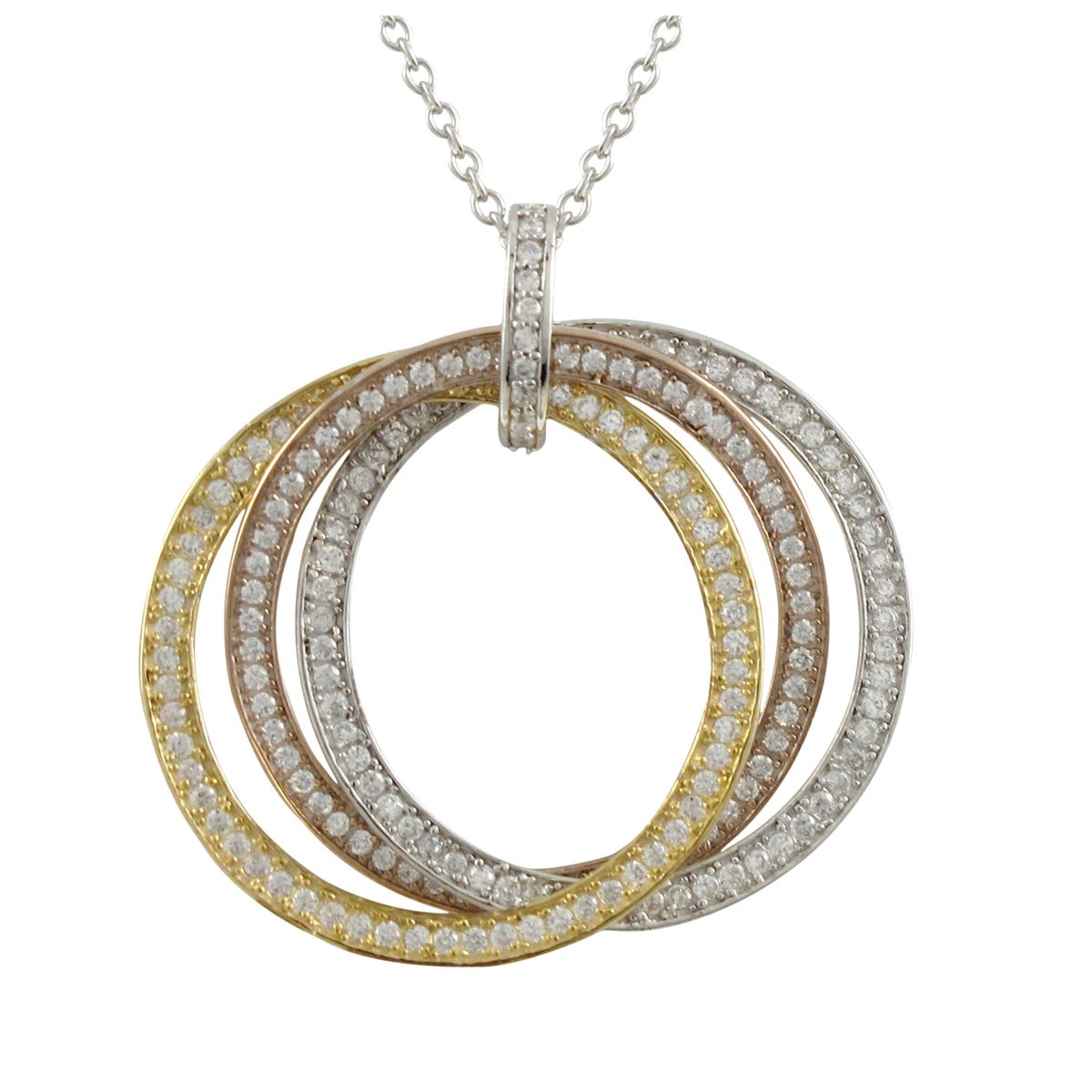 Tri Color Sterling Silver, Three 29Mm Linked CZ Rings Pendant
