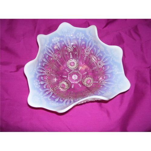 Tri Corner Footed Bowl White Opalescent with flowers.