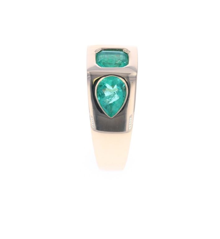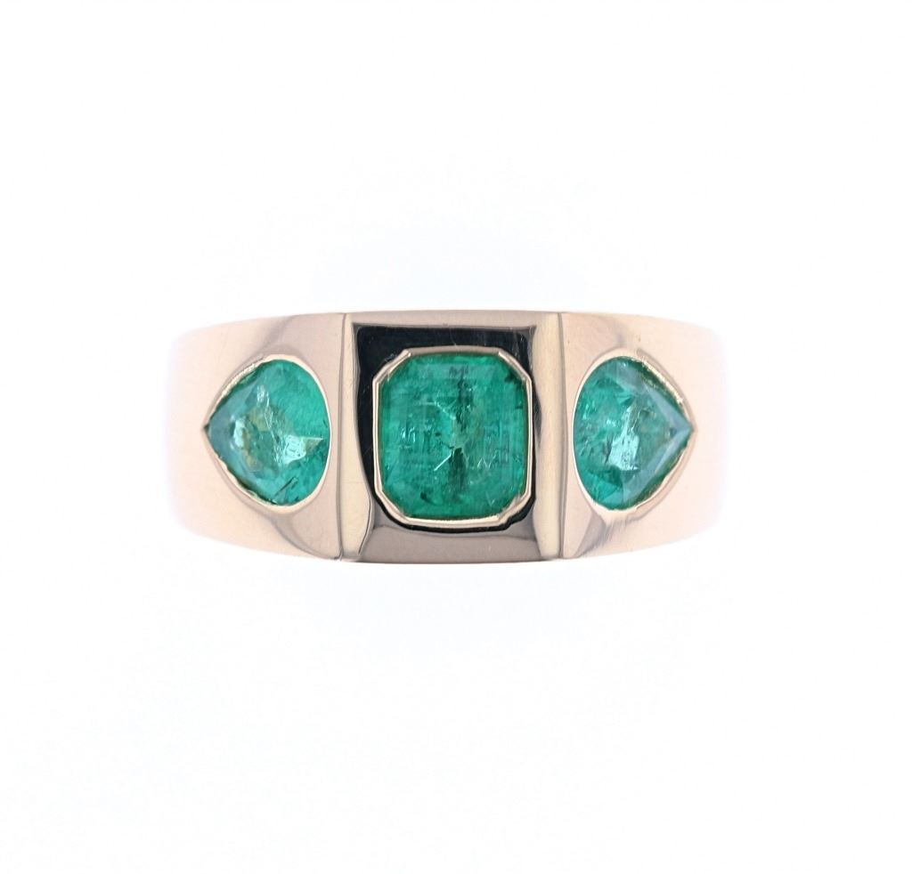 Featured in this lot is this tri-stone "Trinity" emerald and 18k yellow gold ring with AIGL paperwork. The ring features a polished, stamped and tested 18k yellow gold ring with a bright finish and is in new condition with excellent workmanship and shows an Oscar Freidman hallmark with a '18k' gold stamp next to the hallmark. The ring features a tri-stone faceted construction otherwise known as a trinity ring setting. The stone set into the ring are 3 octagonal and pear cut natural emeralds that shows measurements for the octagonal stone are 6 x 5mm, and for the pear cut 7 x 5mm. The stones show green coloration with a very good cut grade that shows a total weight of 2.15 carats. The piece comes complete with AIGL Inc.(American International Gemological Laboratories, Inc. a GIA certified lab AIGL#: K33E56-EA16626) report and appraisal confirming the above info and giving a total value of $8,500.00. The ring size is US 7.