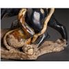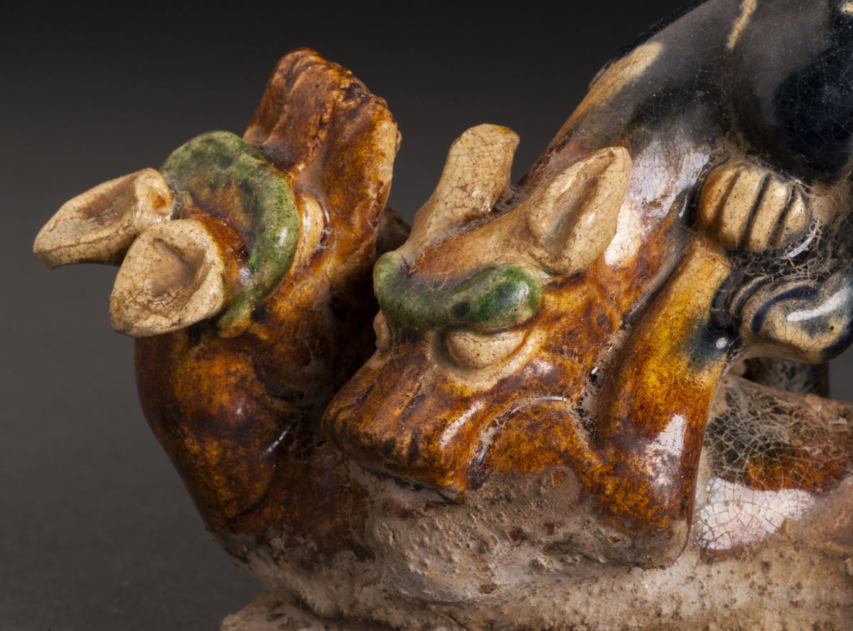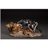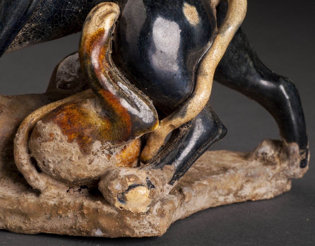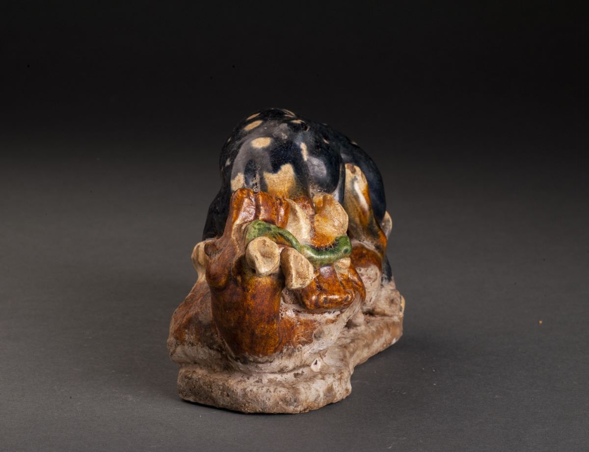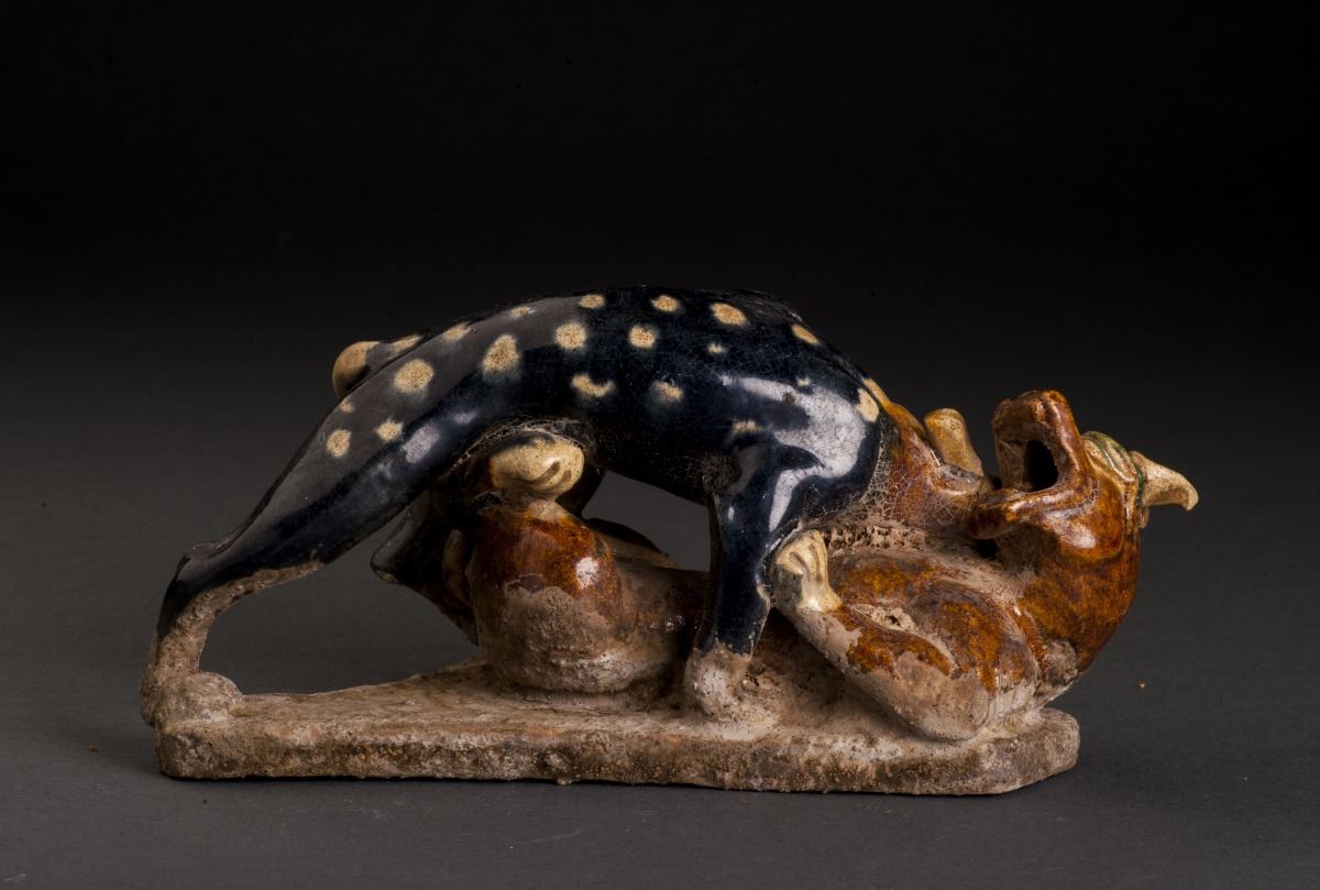 Two Delicate Designed Leopards Statue In Good Condition, With The Fine Tri-color Glazed. The Two Leopards Are Playing Together, One Glazed In Alternative Dark Brown With White Spots On Back, The Other In Yellow And LyingOn The Stand.