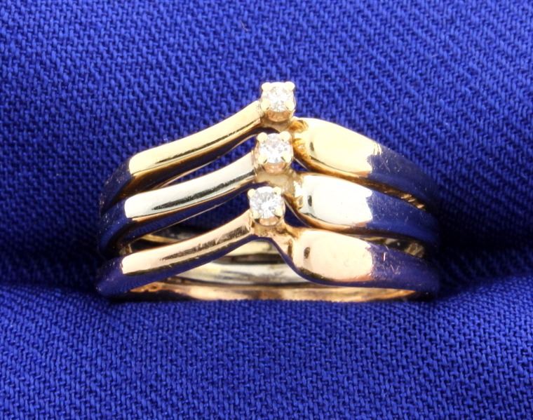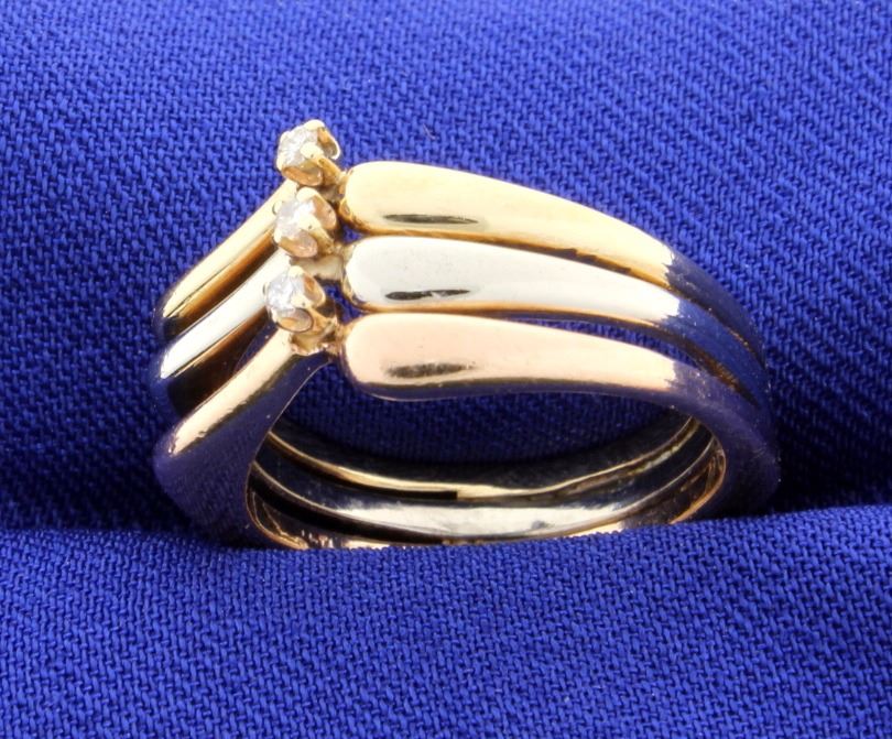 This beautiful tri color stack style 14k gold ring with diamonds is just lovely! The ring is a combination of white, yellow and rose gold. There are three brilliant cut diamonds that total approximately 0.60 carats. Ring is soldered at the base. Size 6 6.5g