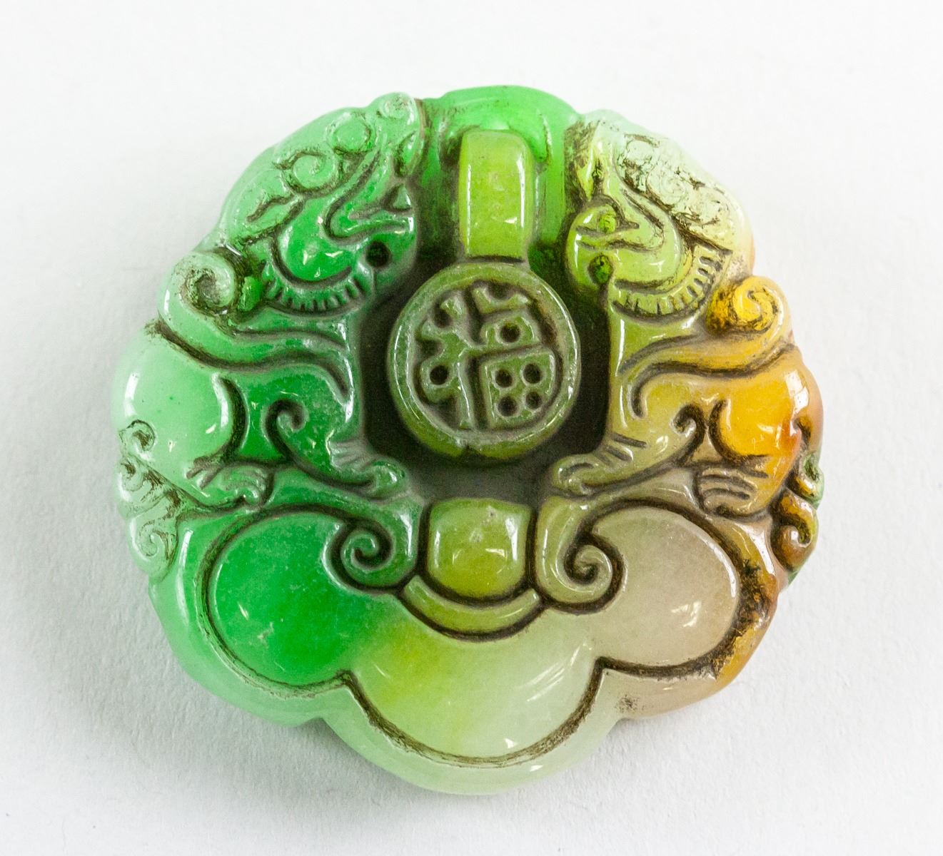 Tri-colored stone pendant. Of green, orange, and white tone. Character for "fortune" carved in center on both sides. Diameter: 5 cm, 43 grams, Density: 2.55.