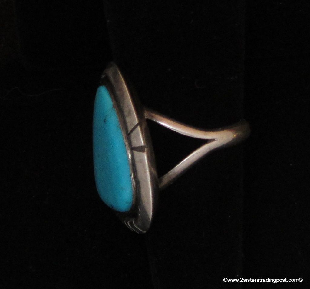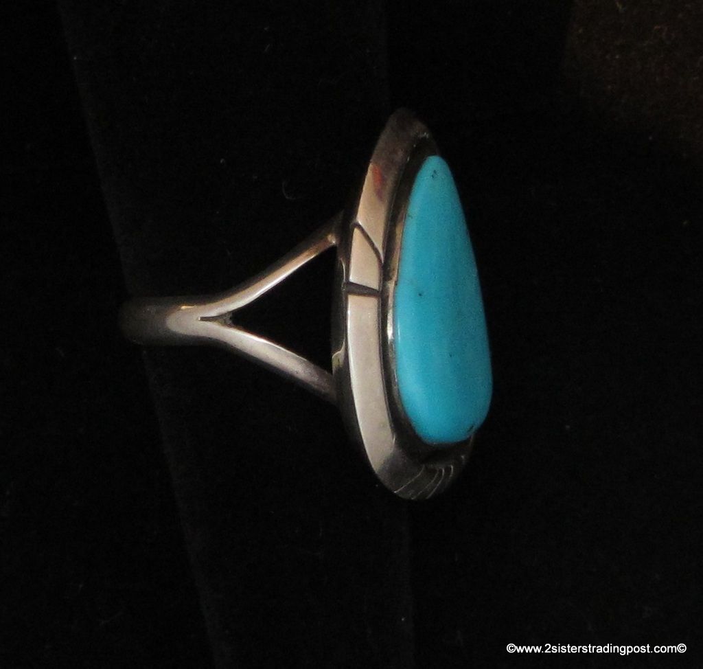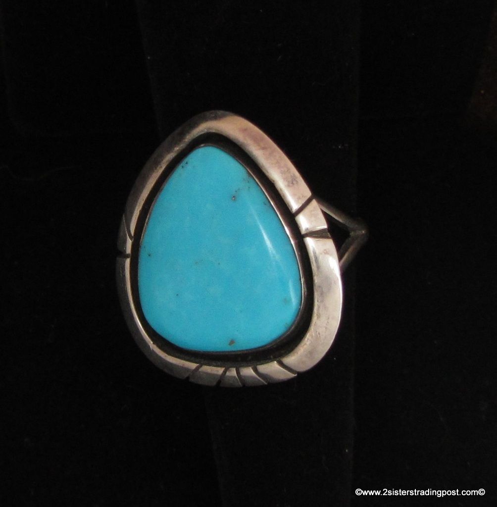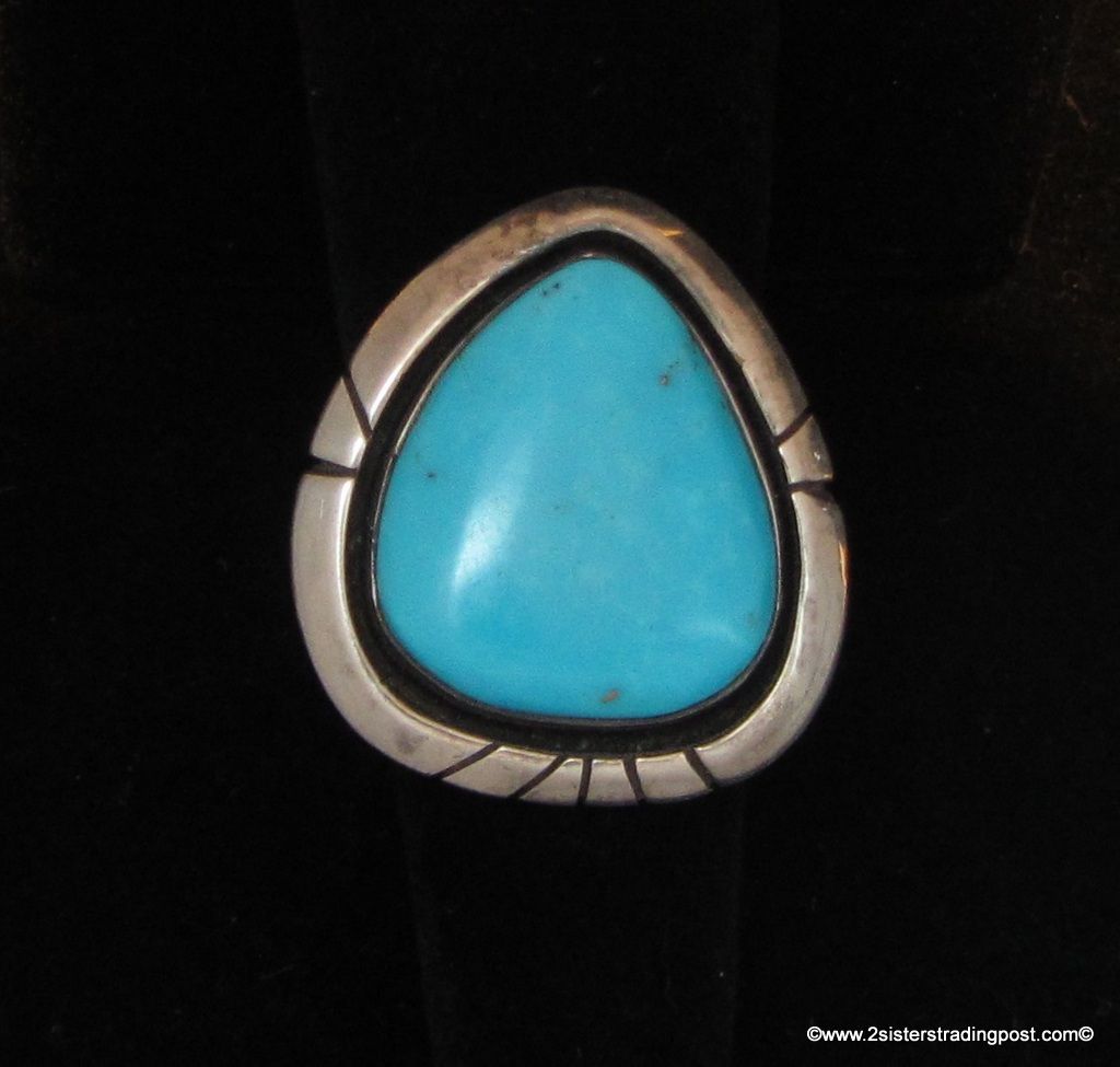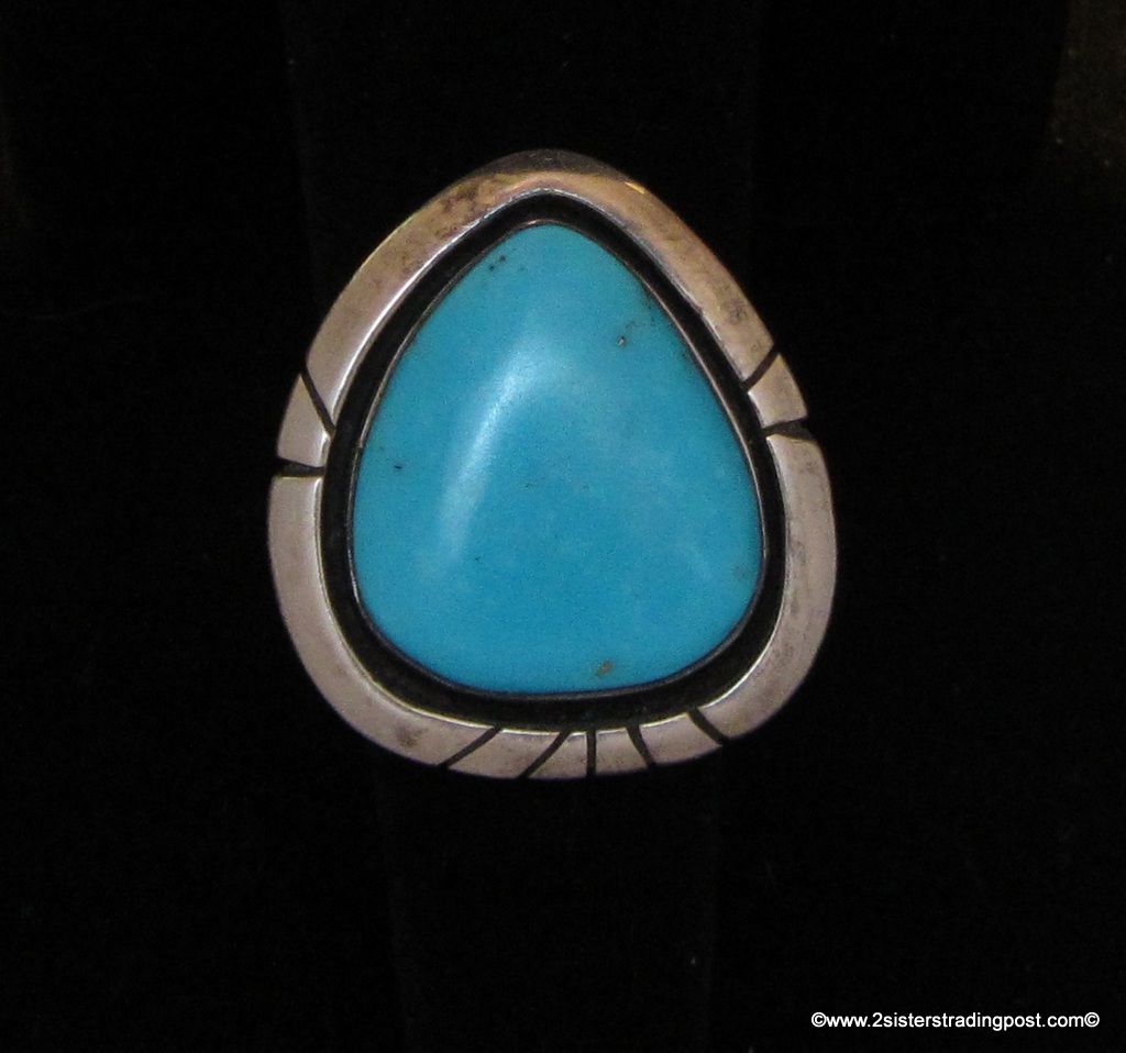 Size 7.25 triangle shaped ring has very nice piece of blue turquoise. The stone measures 19.6 mm x 16.9 mm and the overall ring measures 26.1 mm x 23.6 mm. The ring has a narrow band and weighs 9.3 g. The ring is stamped sterling and cursive etched 'naranjos'