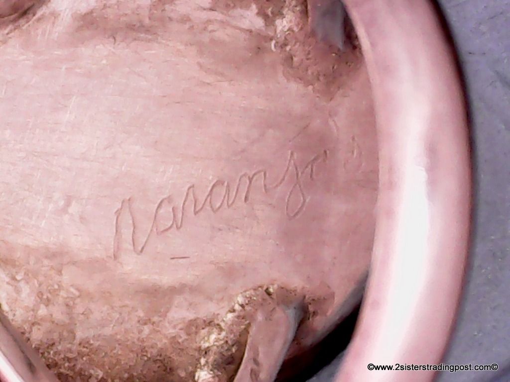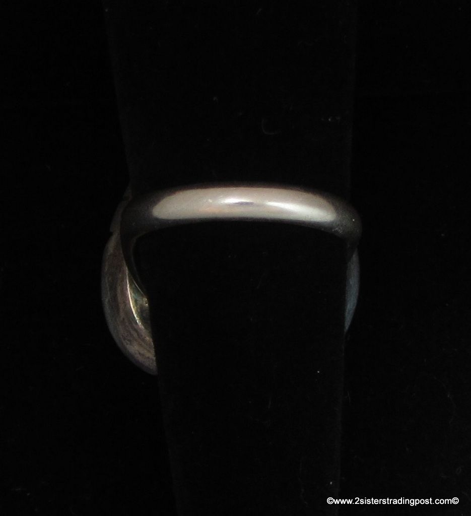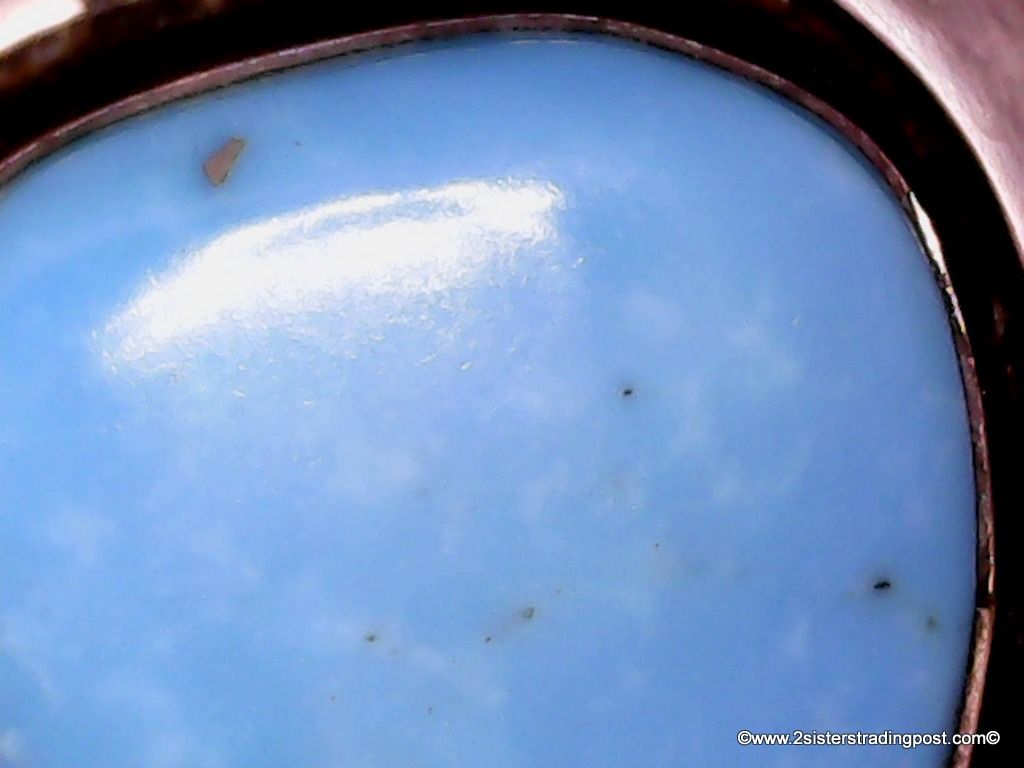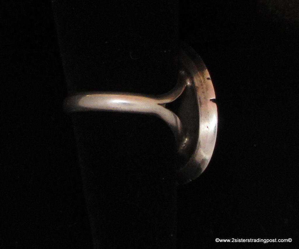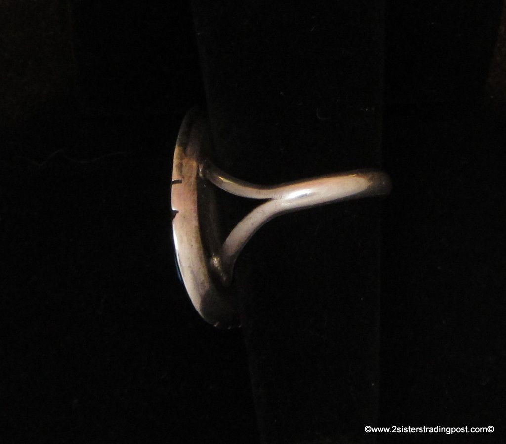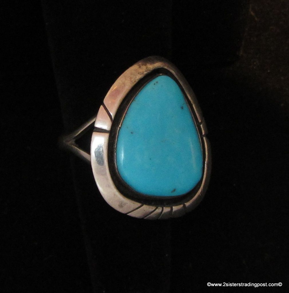Size 7.25 triangle shaped ring has very nice piece of blue turquoise. The stone measures 19.6 mm x 16.9 mm and the overall ring measures 26.1 mm x 23.6 mm. The ring has a narrow band and weighs 9.3 g. The ring is stamped sterling and cursive etched 'naranjos'