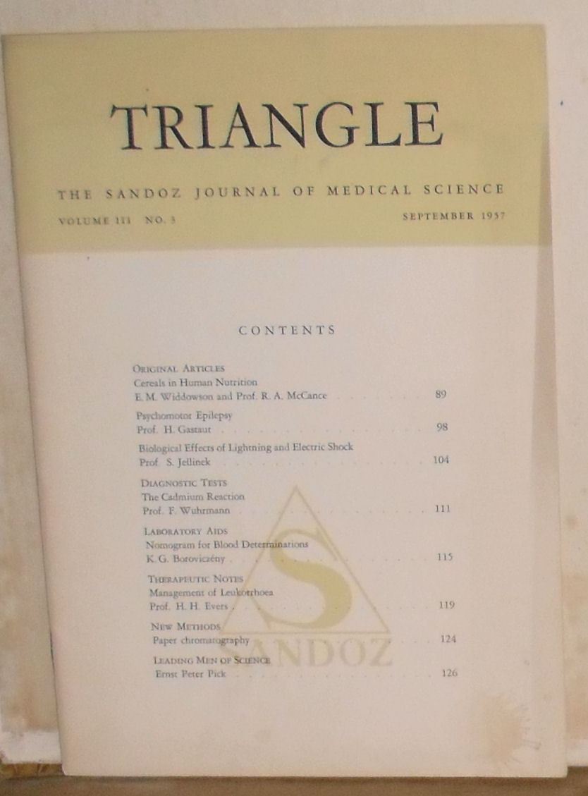 Triangle, medical magazine about 10 high by 7 inches with over 40 pages of photos and texts: 'Cereals in Human Nutrition'; 'Psychomotor Epilepsy'; Biological Effects of lightning and Electric Shock'; 'Diagnostic Tests the Cadmium Reaction'; Laboratory Aids: Nomogram for Blood Determination'; Therapeutic Notes, Management of Leukorrhoea'; New Methods, Paper chromatography'; Leading Men of Science, Ernst Peter Pick; in this The Sandoz Journal of medical science, Volume III, number 3, 1957, like a textbook, collectible item, for specialists and others.