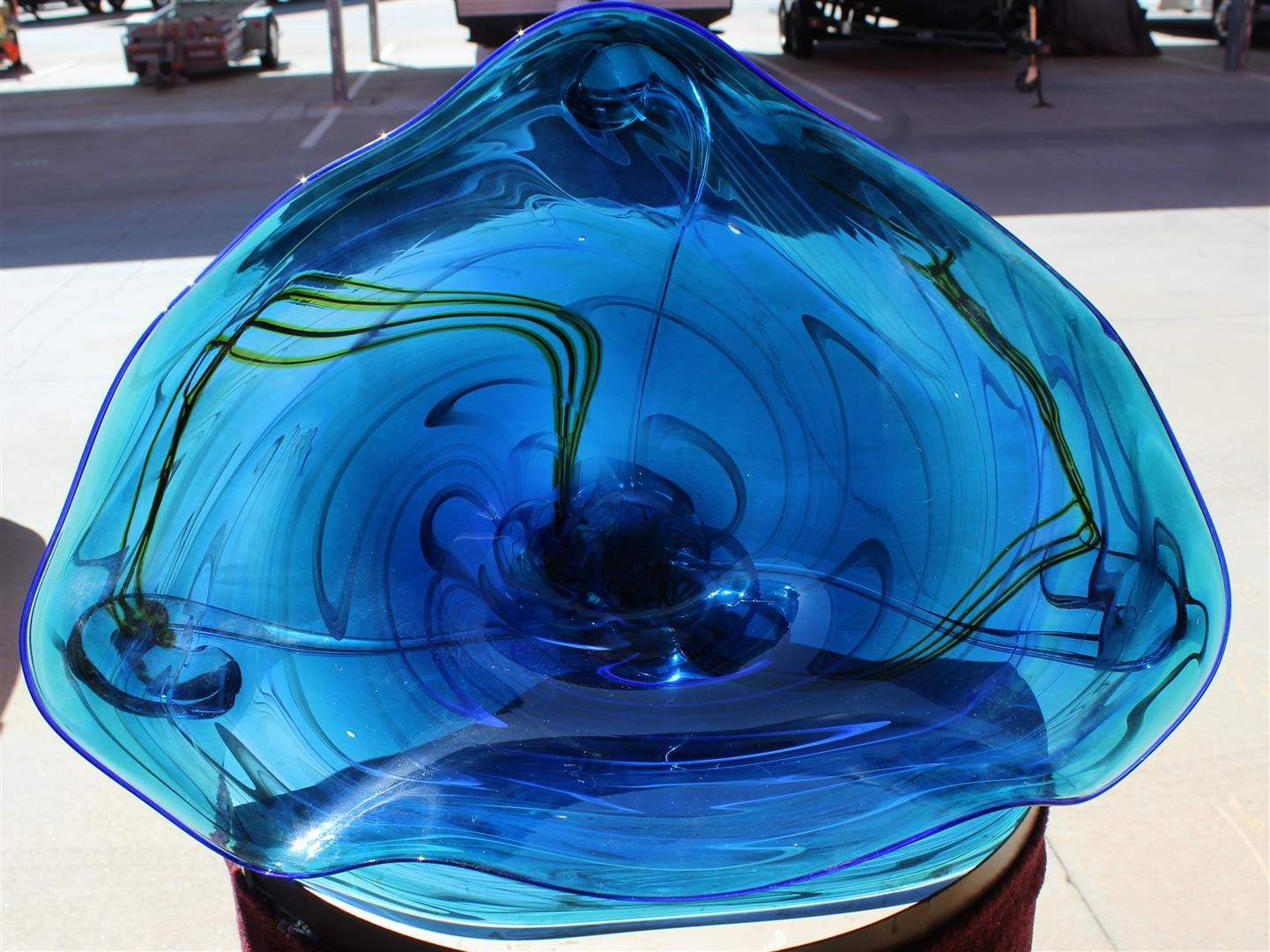 A vivid, deep blue, triangular-shaped glass bowl with swirls of green highlights is displayed by glass sculptor, Dutch Schulze. The bowl #6269 measures 22 x 8.