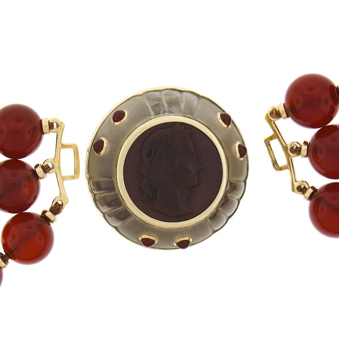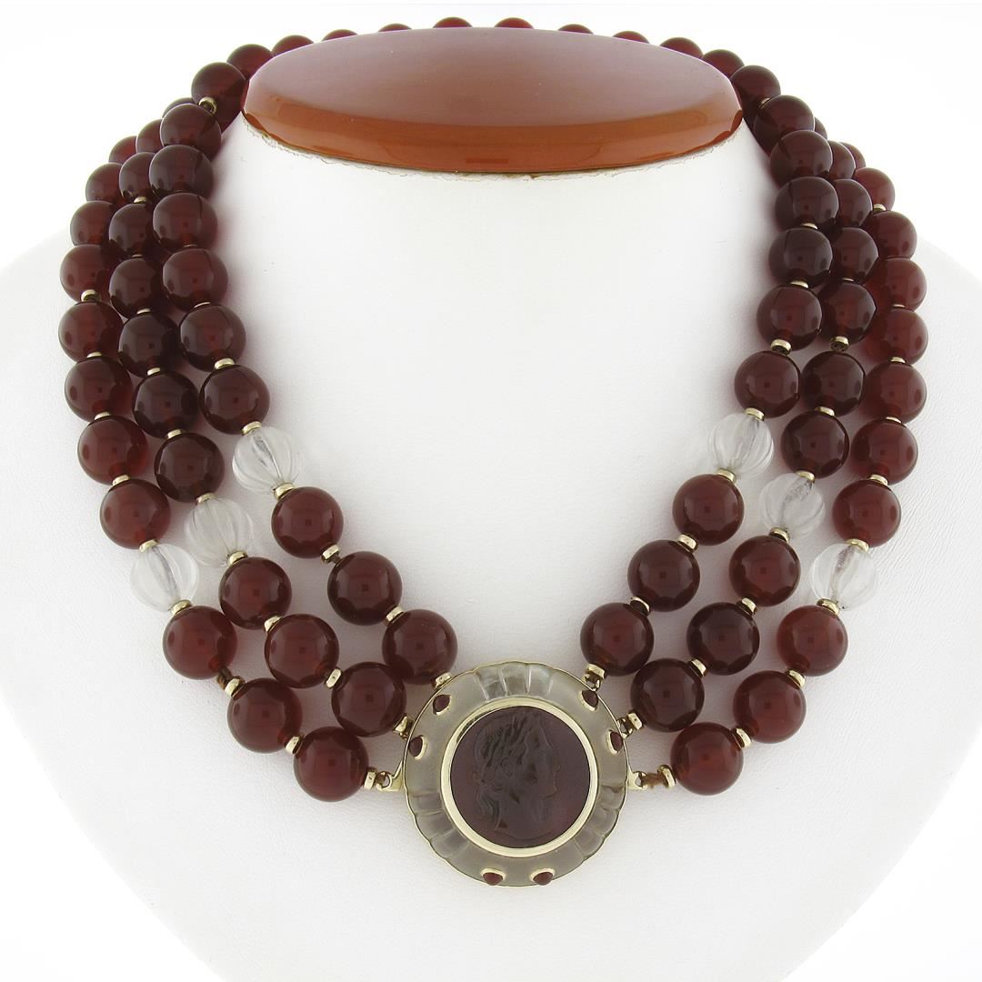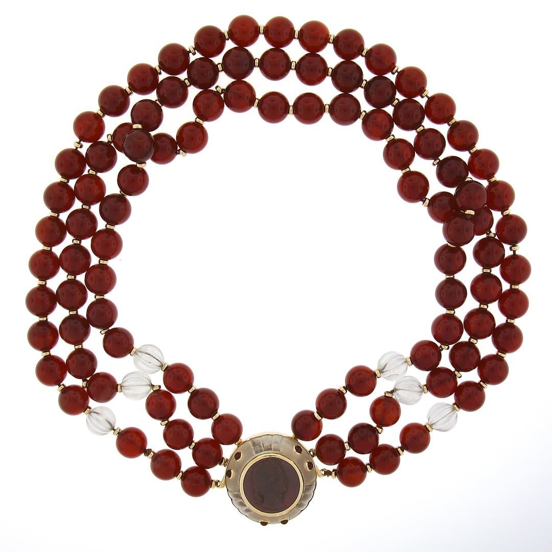 A 3 strand necklace with 14k yellow gold clasp and spacers, featuring numerous round shape natural carnelian (10mm to 10.5mm each), 6 grooved bead shape natural rock crystal (9.8mm to 10mm each), 1 round shape carved natural carnelian (18.1mm), 6 round cabochon cut natural carnelians (2.5mm each), and 1 round shape natural rock crystal (29.1mm ). It weighs a total of 167.57 grams, measures 30.5mm wide at the pendant, and measures 16 inches in length.