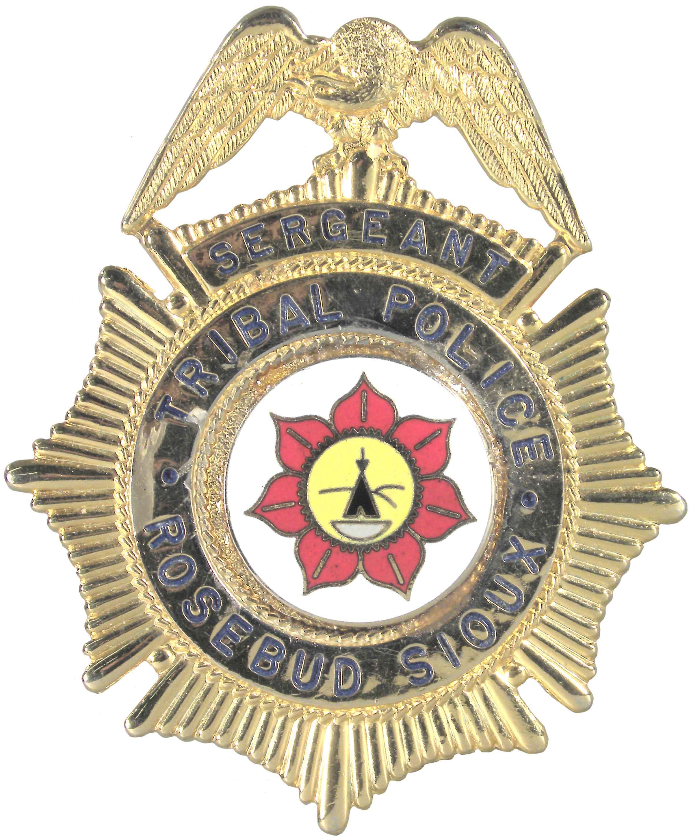 Tribal Police Rosebud Sioux Sergeant Badge. Enamel center with gold plating. New condition. 2 1/4 X 2 3/4 inches.