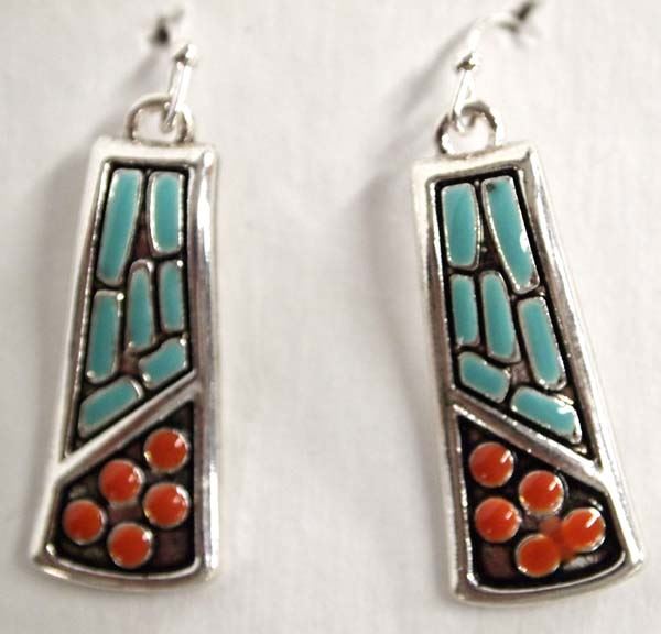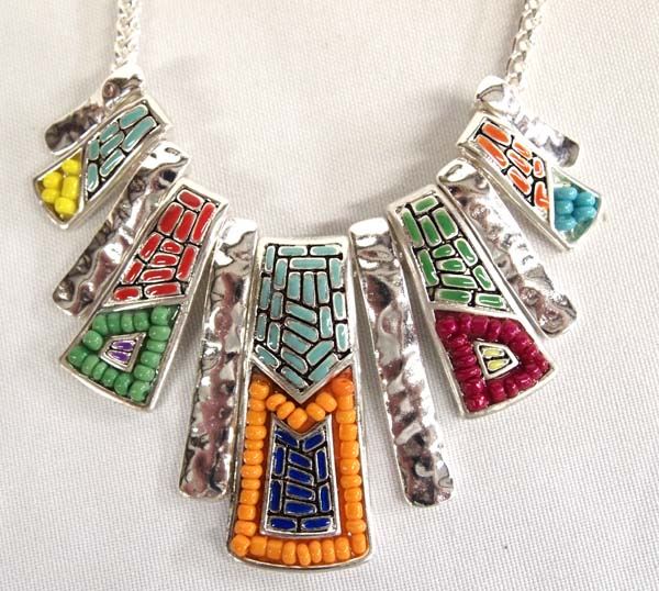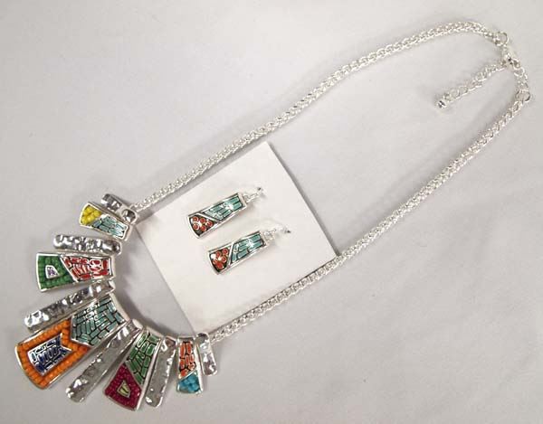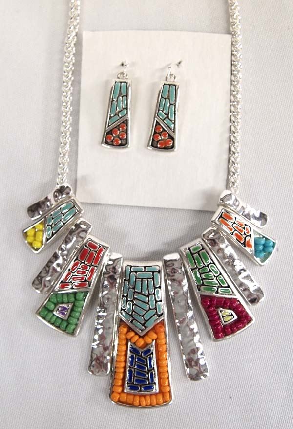 Tribal Style Necklace and Earrings, embellished with enamel inlay and bead accents, necklace measures 16'' end to end and earrings measure 1''L, beautiful color combinations