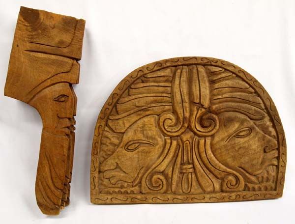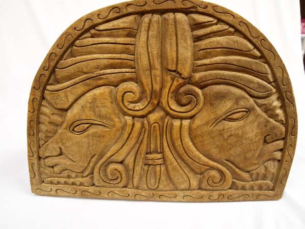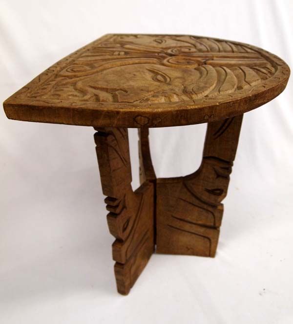 Tribal Tri-Legged Wooden Table. Profiles of faces are carved on the three legs and on the top. Top is semi-circle shape. 17.25''H x 18.5''W. Nice to display your collectibles or a plant.