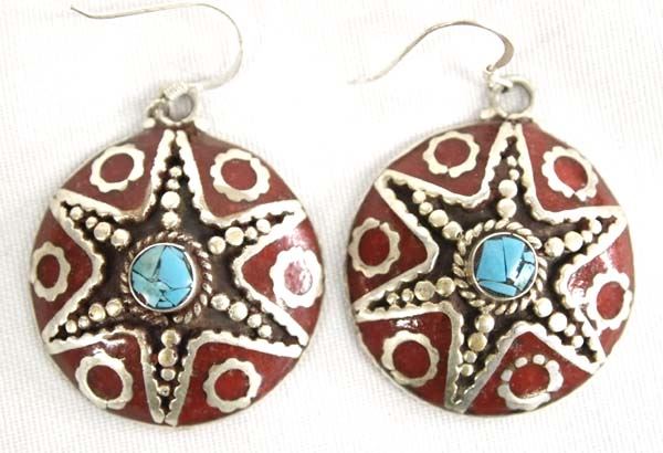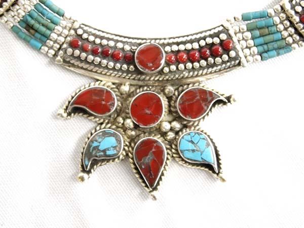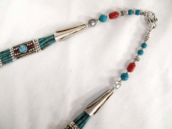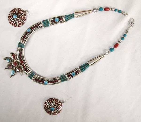 Tribal Turquoise and Coral Necklace and Earrings, necklace measures 20'' end to end, pendant measures 2'' x 2'', and earrings measure 2'' x 1 3/8'', very flattering on