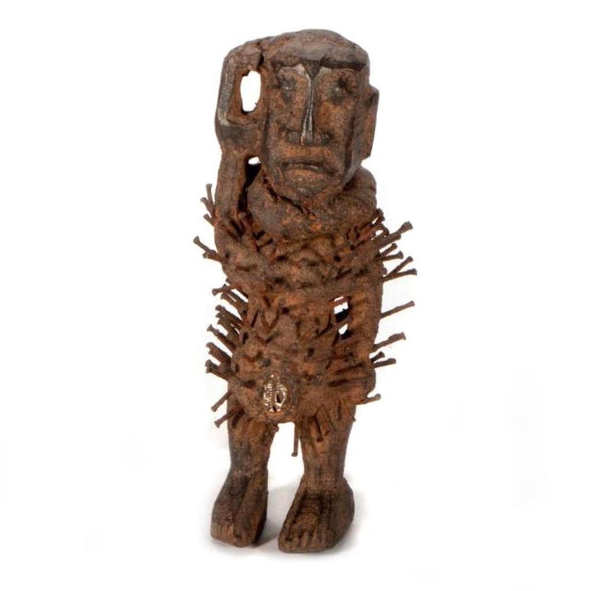 Tribal art wood carving in the form of a male decorated with nails.. 9 1/2 inches in length.