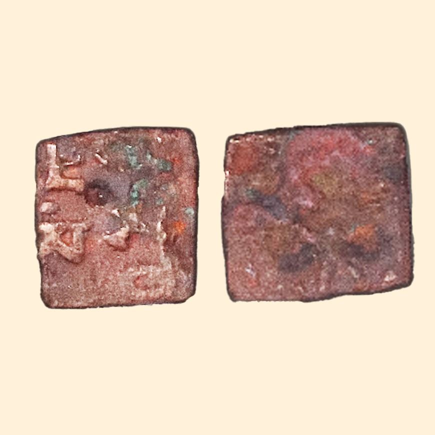 Tribes of Punjab, Vrishnis (c. 200 BC). Copper Unit, 1.17gms, OBV: Brahmi legend in two lines ‘Jiya Sasya, REV: Sudarsanachakra. (Pieper # 1593). Fine, Very Rare. Earlier only one silver coin was known in BMC from Cunningham collection, later then few more come to light with some copper also. But the above specimen not mention the tribe name and on rev is wheel that’s representing the Vaisnative symbol on Vrishni tribes.