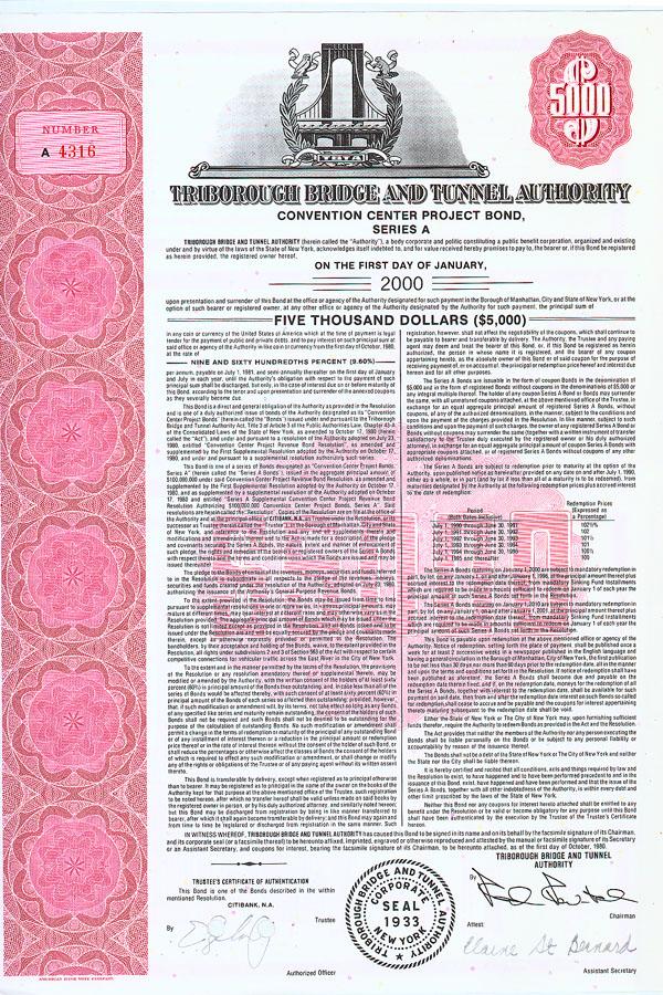 1980, New York. Bond for $5000 bearing 9.6%. Pink/Black. Top center vignette of a bridge. Attached coupons. Punch cancelled and very fine.