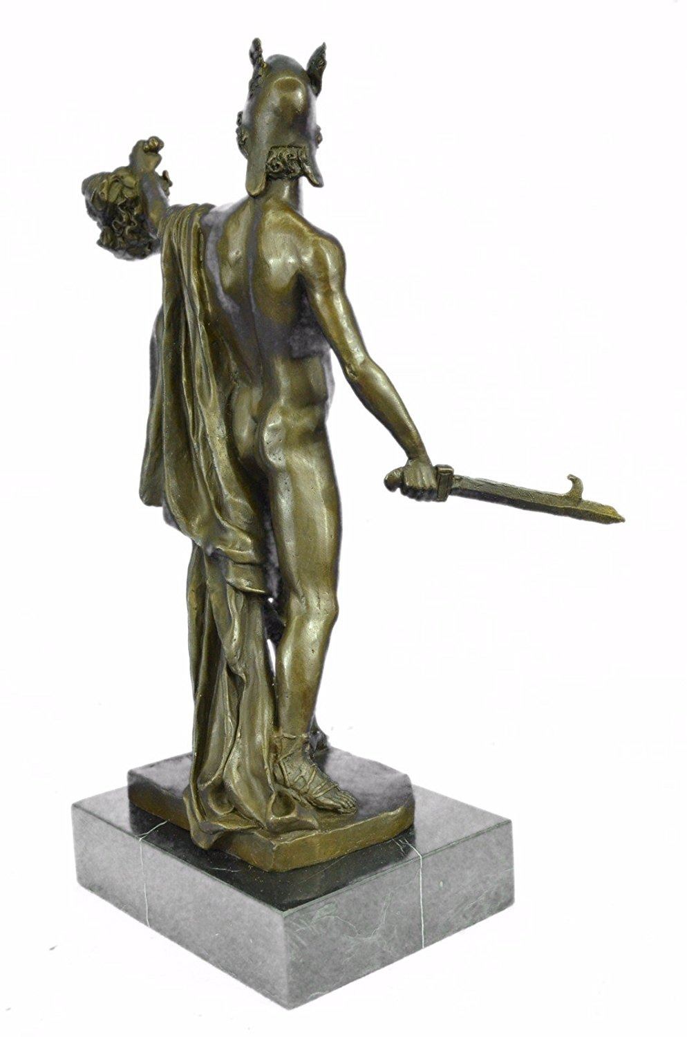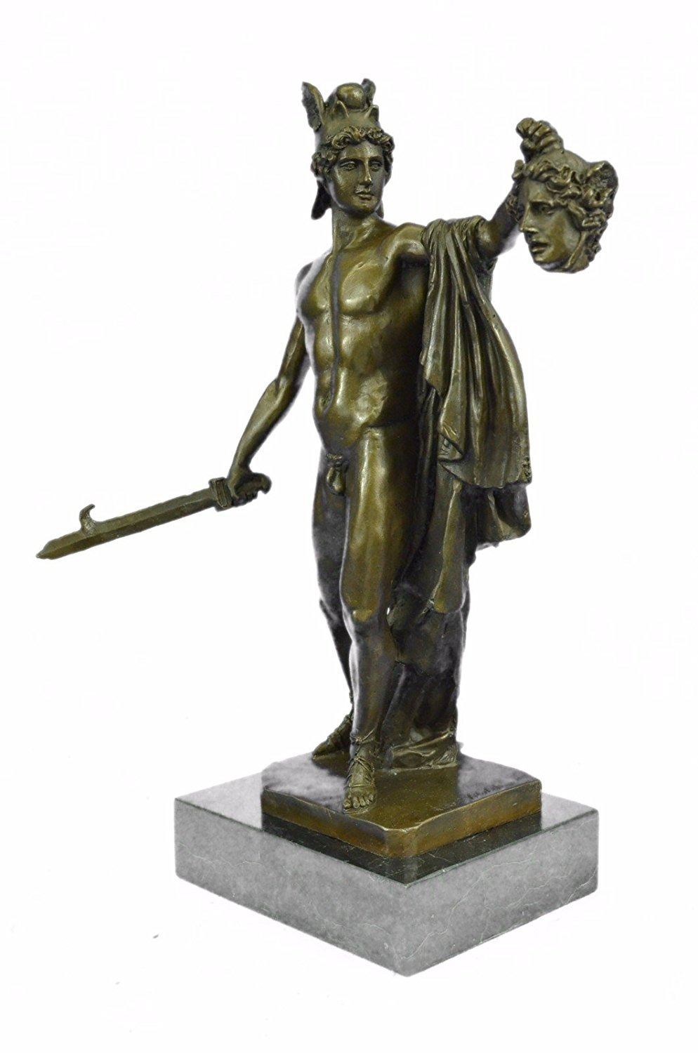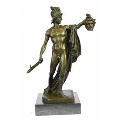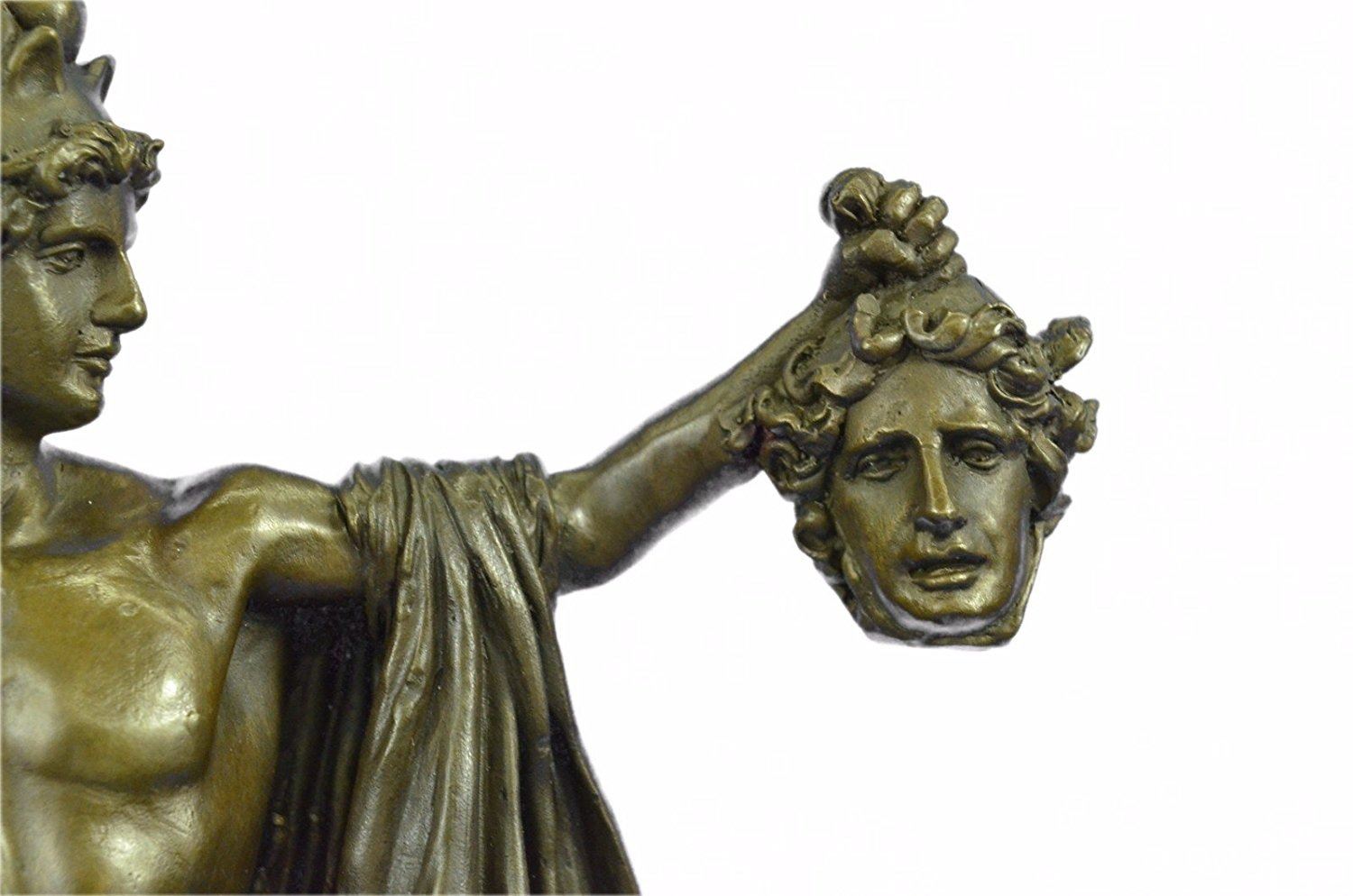 Cellinis Bronze Sculpture of Perseus Beheading the Medusa was the defining masterpiece of the Florentine sculptors career. Much has been written about it but, of particular interest, is Michael Coles 1999 article, Cellinis Blood, in which he relates how this was the first major Bronze Sculpture cast in Florence for half a century. The story goes that as Perseus slit the Medusas neck, the winged horse Pegasus sprang from her blood and flew up to Zeus in the heavens, thus becoming a symbol for poetic inspiration. In that sense the gushing blood, a notably new element in Cellinis conception, symbolizes creation and the creative process. The Bronze Sculpture was molded using the ancient method of lost wax casting and finished with a brown patina tarnish. The Sculpture is mounted upon a black variegated marble base. Bronze Dimensions with Marble Base: Height 15 X Width 12 inches. Weight: 12 LBS.