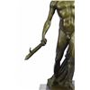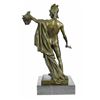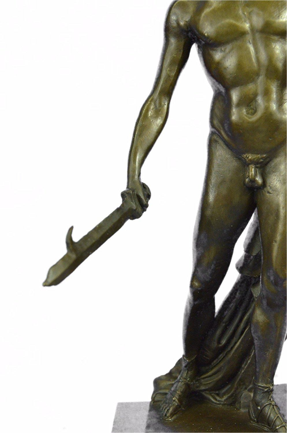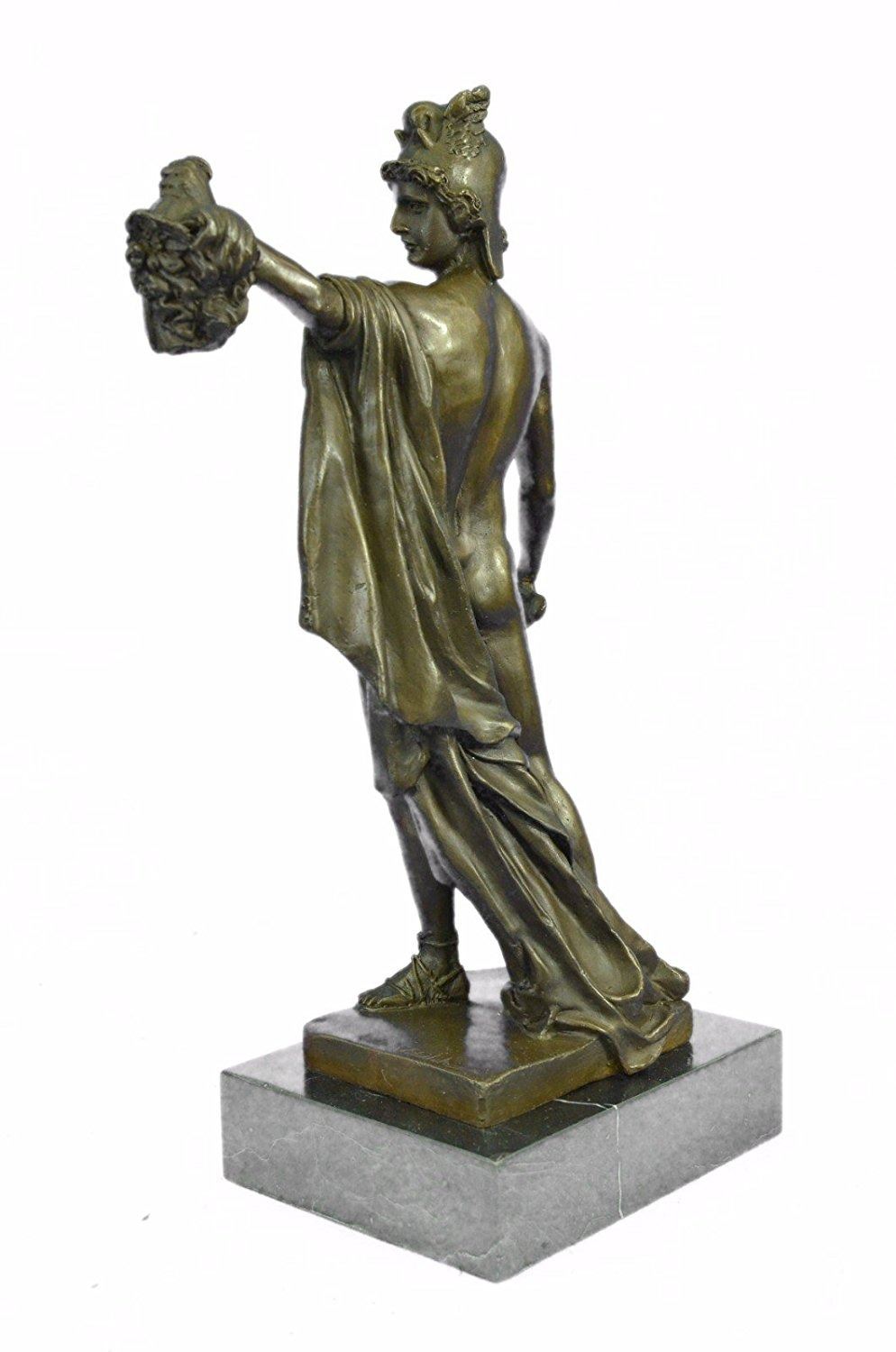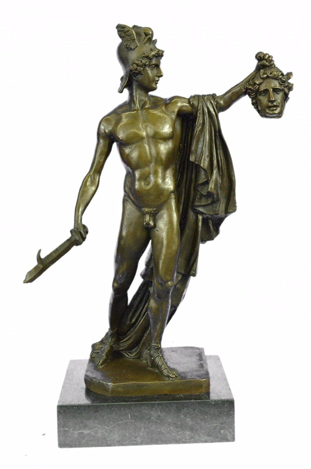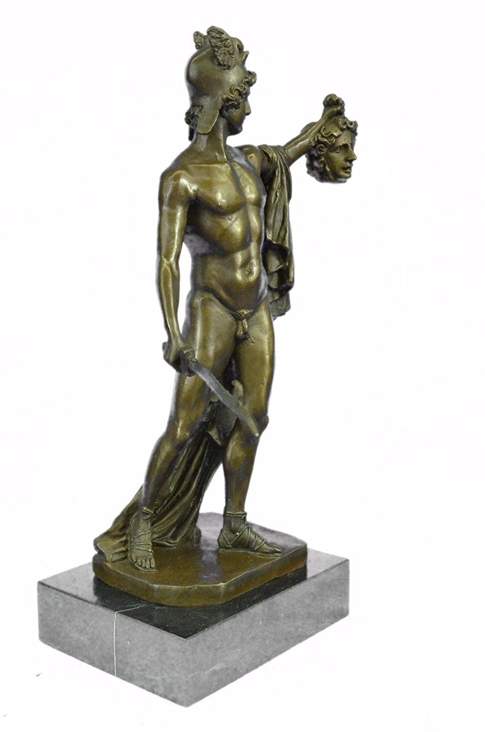 Cellinis Bronze Sculpture of Perseus Beheading the Medusa was the defining masterpiece of the Florentine sculptors career. Much has been written about it but, of particular interest, is Michael Coles 1999 article, Cellinis Blood, in which he relates how this was the first major Bronze Sculpture cast in Florence for half a century. The story goes that as Perseus slit the Medusas neck, the winged horse Pegasus sprang from her blood and flew up to Zeus in the heavens, thus becoming a symbol for poetic inspiration. In that sense the gushing blood, a notably new element in Cellinis conception, symbolizes creation and the creative process. The Bronze Sculpture was molded using the ancient method of lost wax casting and finished with a brown patina tarnish. The Sculpture is mounted upon a black variegated marble base. Bronze Dimensions with Marble Base: Height 15 X Width 12 inches. Weight: 12 LBS.
