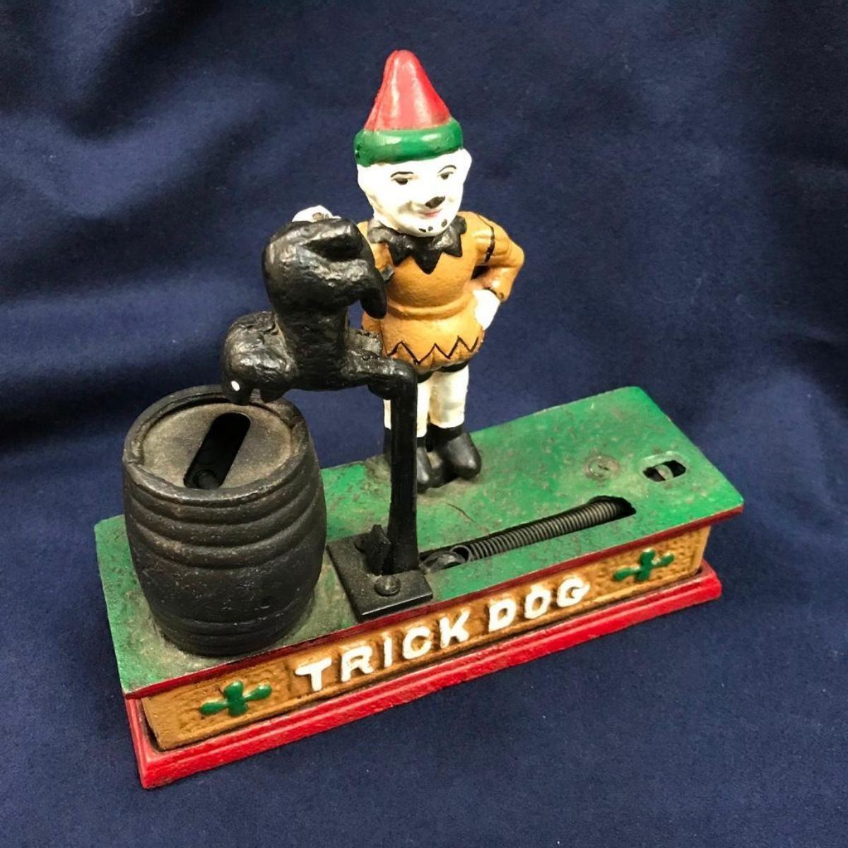 Trick Dog painted cast iron toy bank, vintage item created after an original late 1800's toy bank. 8" W X 6 3/4" H X 2 1/2" D.Â