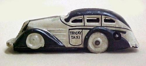 Tricky Taxi; tin wind-up toy; MAR Made in the U.S.A. Pat# 2001.6.26; 4" across; winding key missing, some paint wear.