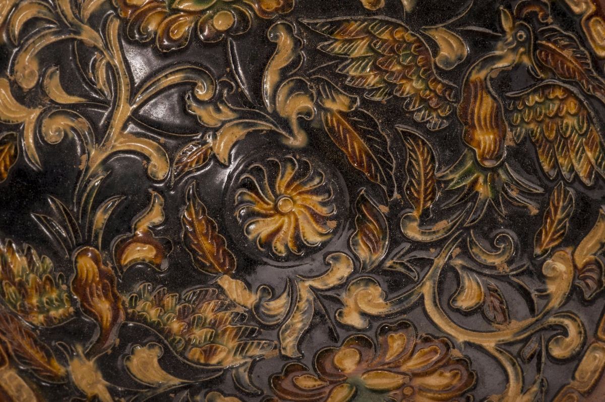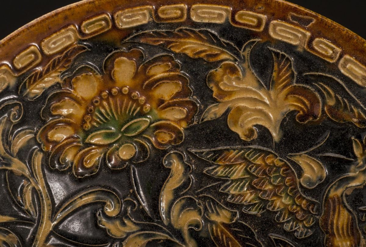 Within The Alternative Brown Tone Throughout, This Fine Porcelain Plate With Fine Carved Flowers And Vivid Phoenix At The Main Surface. Within The Form Of Bamboo-hat Shape. Glazed In Green Tone At The Back Edge.