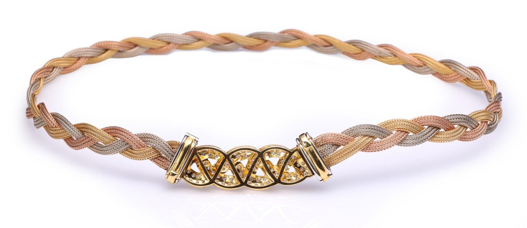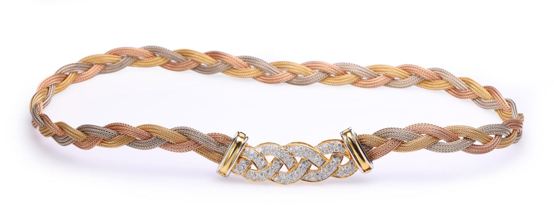 Finely woven tricolor gold necklace mounted with matching 18k yellow gold and diamond centerpiece; gross weight 59.5 g, length 17" (approx.)