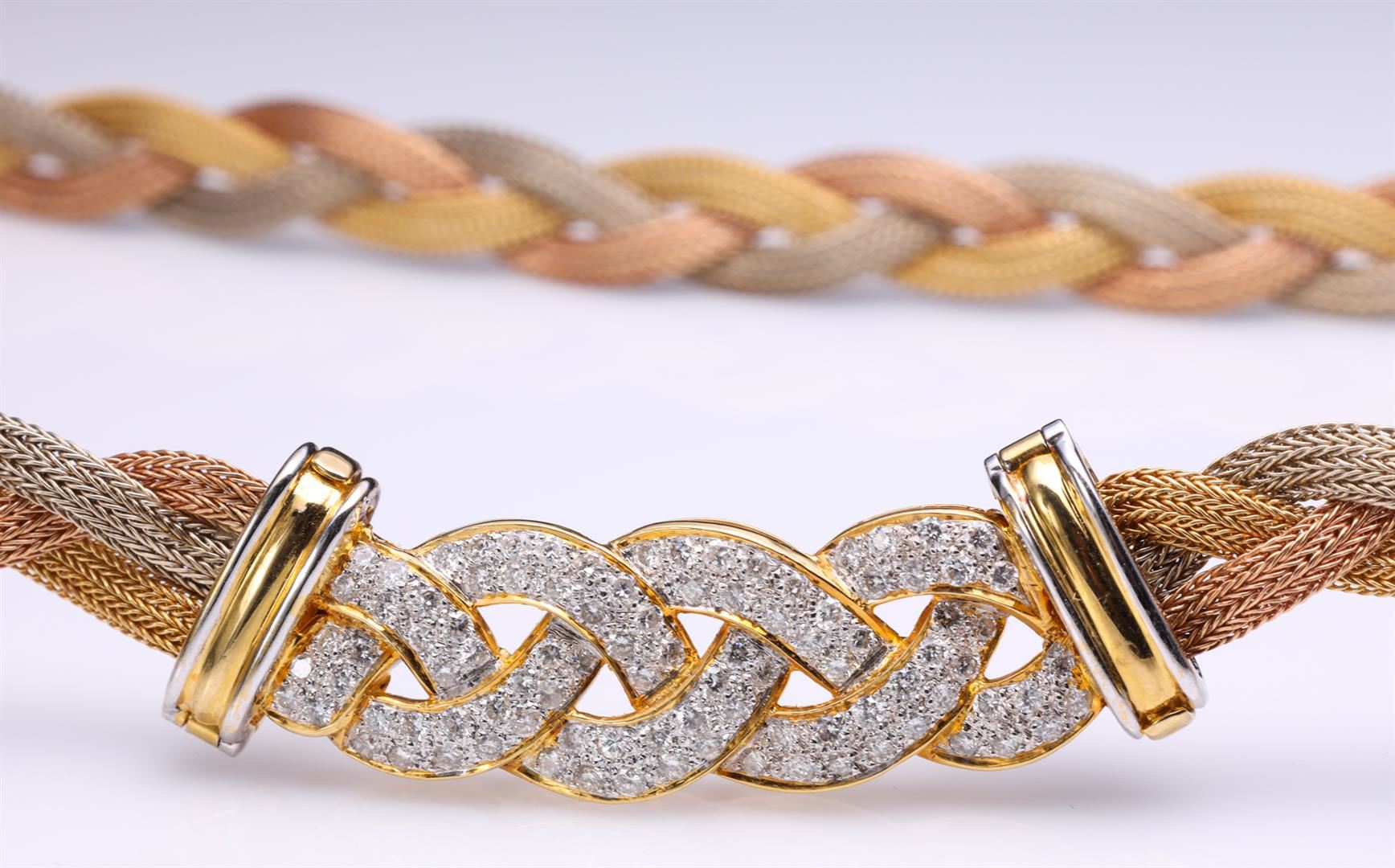 Tricolor Gold Necklace Mounted with 18K Yellow Gold and Diamond Centerpiece containing brilliant cut round diamonds weighing approximately 0.38 cts. Total weight of 59.60 gm. Estimated retail value $14,980
