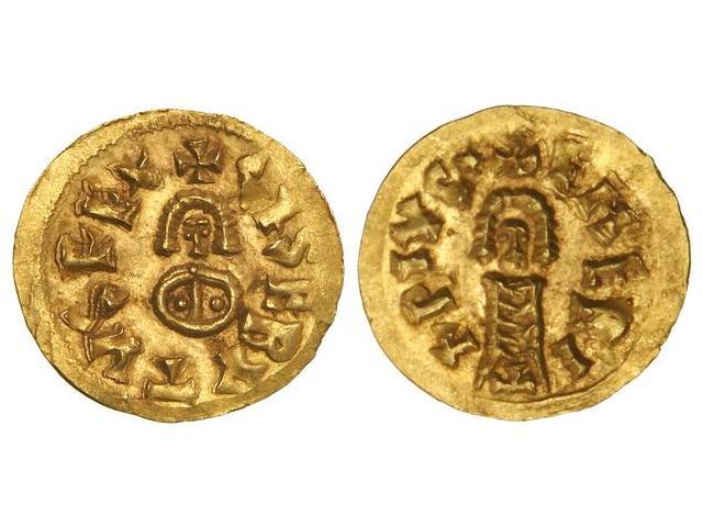 Triente. SISEBUTO (612-621). EMERITA (Lusitania). Anv.: ¶SISEBVTVS REx. Rev.: ¶EMERI/T/¶PIVS¶. AU. Miles-192b var. bustos; VCC-258.10 var. bustos. EBC-.