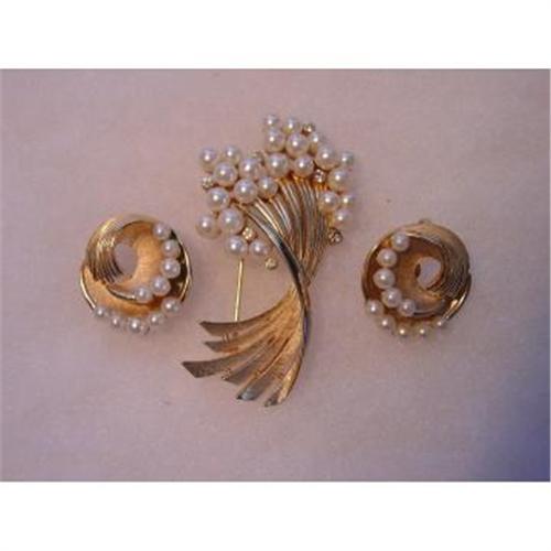 Here is another one of those very collectible old crown trifari 3 piece sets. This is a gold toned leaf or floral design with pearls and rhinestones. This is 2 1/2 inches wide and has pearls and tiny clear rhinestones along the edges. The earrings, have just the pearls with no rhinestones and are clipped in nature. This 3 piece set is in very good condition