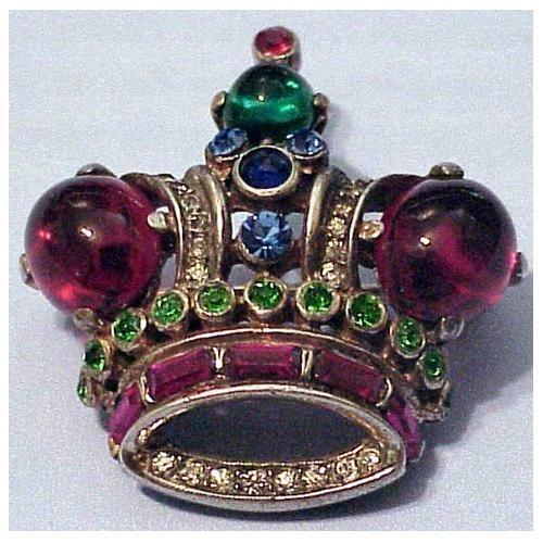 </font></strong>This Trifari crown is sterling with rhinestones and cabochons. It is marked Trifari, sterling, patent 137542. This crown was designed by Alfred Philippe in 1944 and advertised in Vogue on December 15th of 1945. It is in excellent condition except that it needs a good cleaning. It is 1.25" x 1.25"</font>