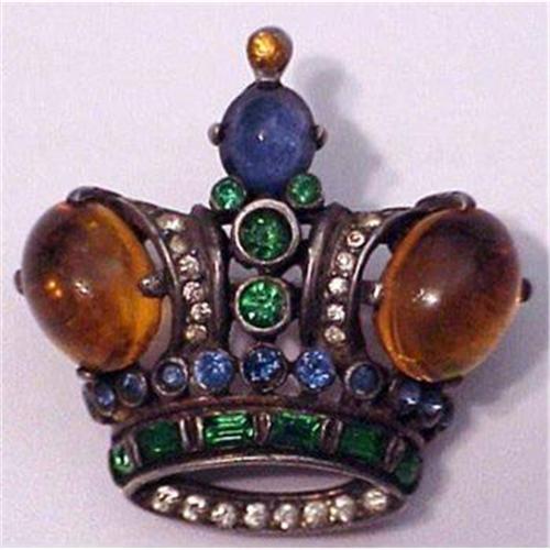 </font></strong>This Trifari crown is sterling with rhinestones and cabochons. It is marked Trifari, sterling, patent 137542. This crown was designed by Alfred Philippe in 1944 and advertised in Vogue on December 15th of 1945. It is in excellent condition except that it needs a good cleaning. It is 1.25" x 1.25"</font>