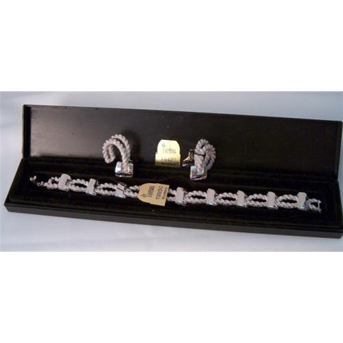 Each piece is signed with the Trifari name & Crown. The paper tag on the bracelet has #72930 and the earrings are marked #16427. They both bear the name "Woodmere". All pieces are mint and there is a nice box for the bracelet.