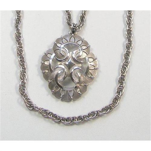 A vintage Trifari silvertone pendant attached to a two strand cross linked chain with safety C-clasp. The pendant has a pattern with loops, petals and other symmetrical designs, in a combination of textured and smooth metal finish. It measures 2.5 x 2 inches and is marked TRIFARI on the back The inner chain has total length of 18 inches and outer is 26 inches. Condition is excellent used.