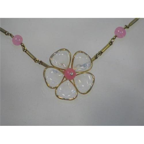 DESCRIPTION: Trifari poured glass flower, translucent white with little pink "seeds" in the center on a goldtone linked chain. ~~~ CONDITION: No missing stones, all in very nice condition. Plating is shiny and solid on the flower. The chain has pretty good plating, but not excellent. The pink beads are excellent as well as the poured glass petals. The clasp works well. ~~~ SIZE: 15 1/4" inches with a 1 1/2" flower. ~~~ MARKED: (Crown) TRIFARI.