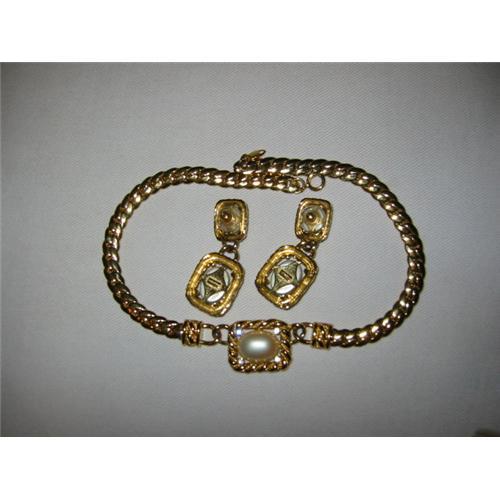This set is gorgeous! signed on all the pieces Trifari TM, and are gold tone with pave diamente rhinestones. It has also a tag on the thick goldtone chain with Trifari Mark and symbol TM. The pierced earings are 2.25 inch by one inch. Something to think about!