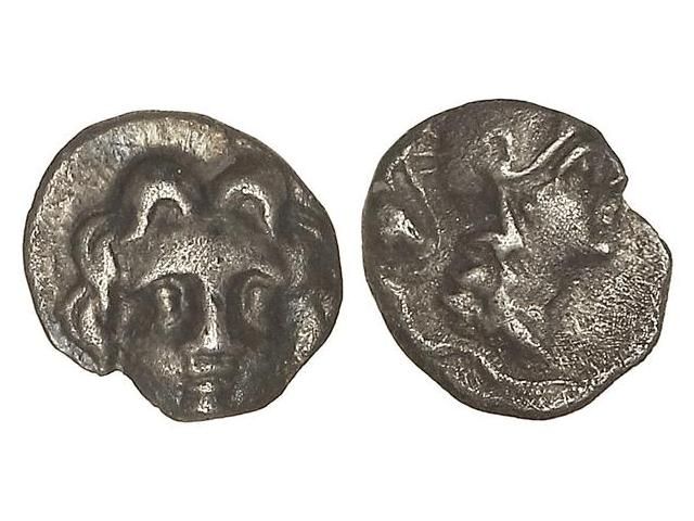 Trihemióbolo. Finales siglo V a.C. HALIKARNASSOS. Anv.: Cabeza laureada de Apolo de frente. Rev.: Busto de Atenea con casco a derecha. 0,97 grs. AR. Se-4877. EBC-/MBC+.