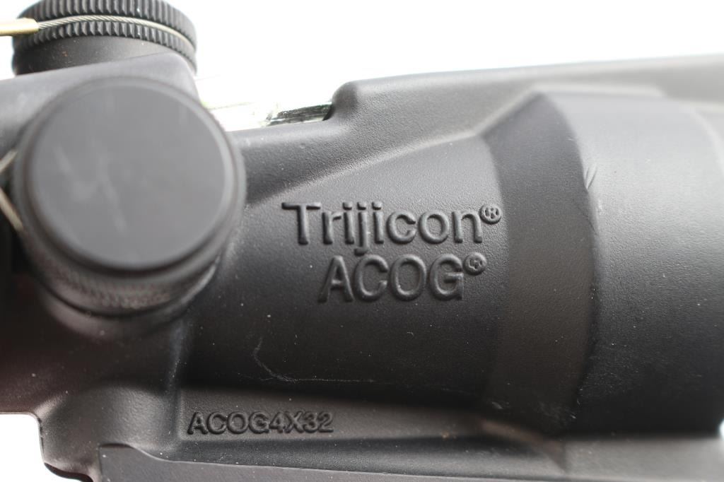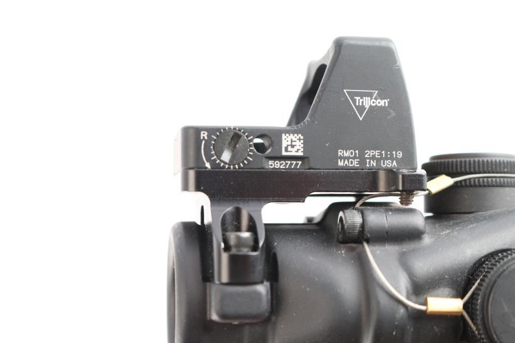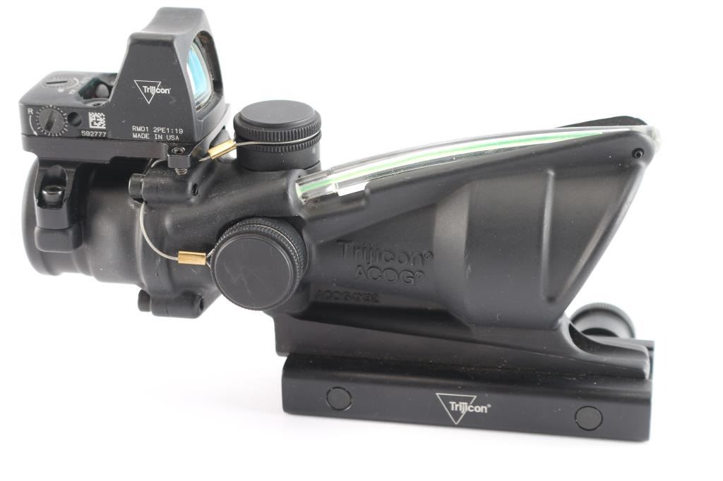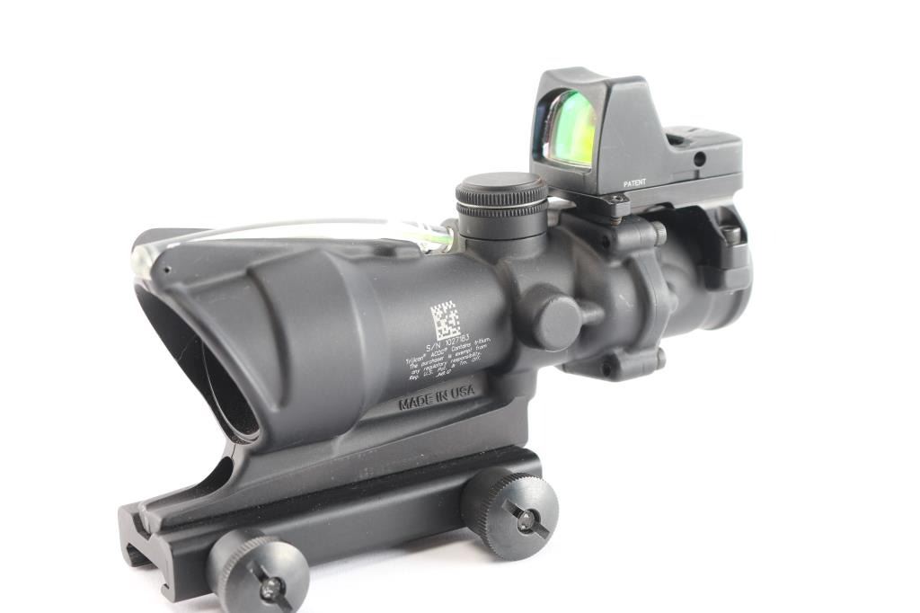 Advanced Combat Optical Gunsight (ACOG) designed for the USMC. Forged 7075-T6 aircraft-aluminum-alloy housing,Trijicon ACOG 4x32 BAC Riflescope w/ Trijicon RMR. Green Illuminated Crosshair .223 Ballistic Reticle, Thumbscrew Mount, Automatic LED 3.25 MOA Red Dot RMR. Like new. With cover.