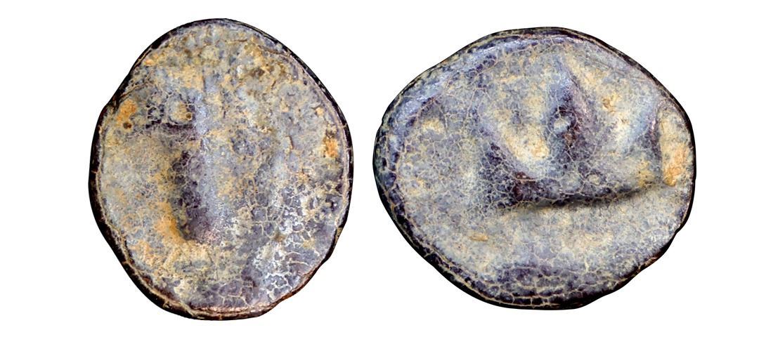 Trikutas, (3rd Century AD), Lead Unit, 1.56 gms, Obv, Three arched hill like symbol, Rev. Traces of an animal, very fine, very rare coin.