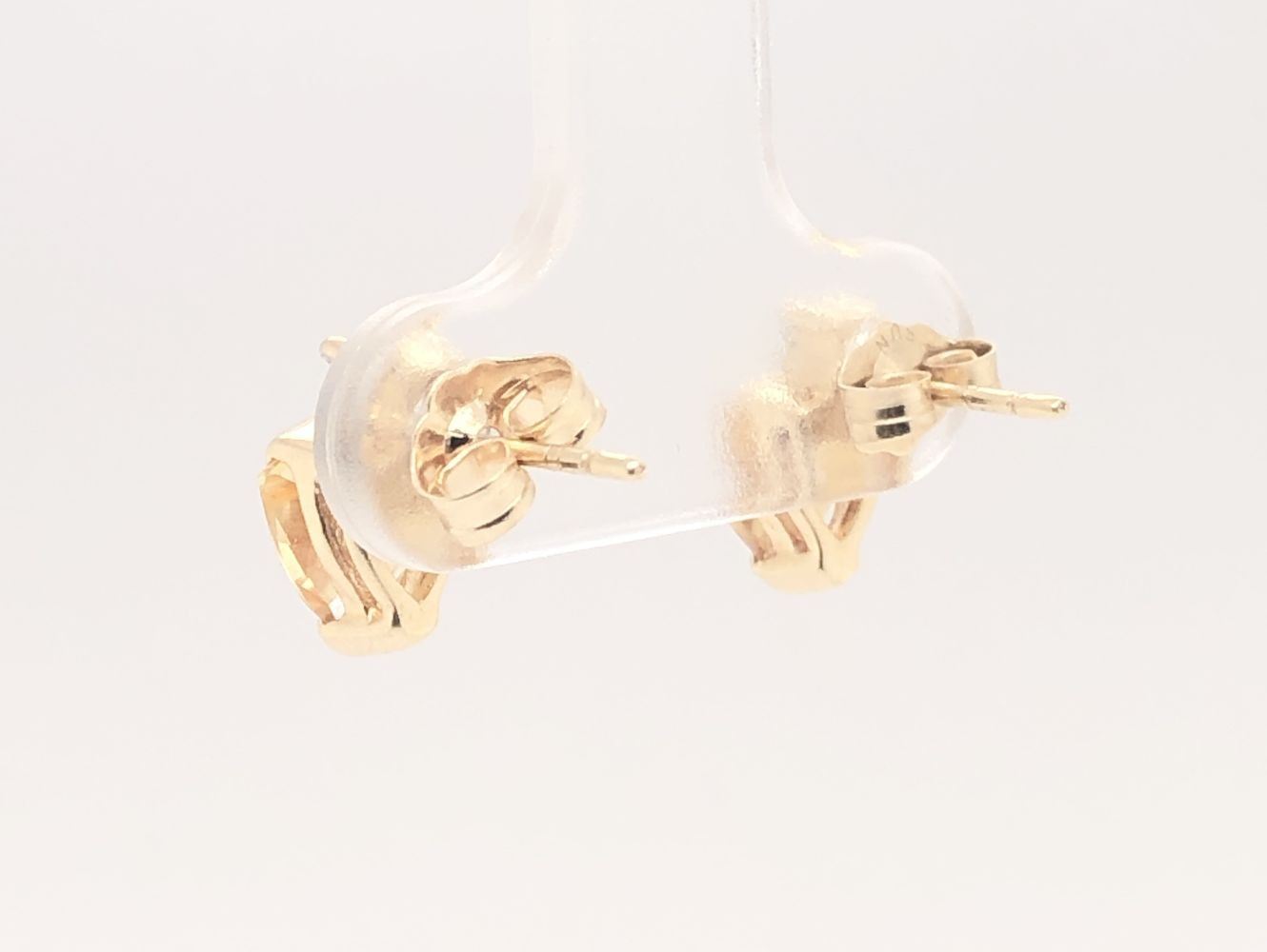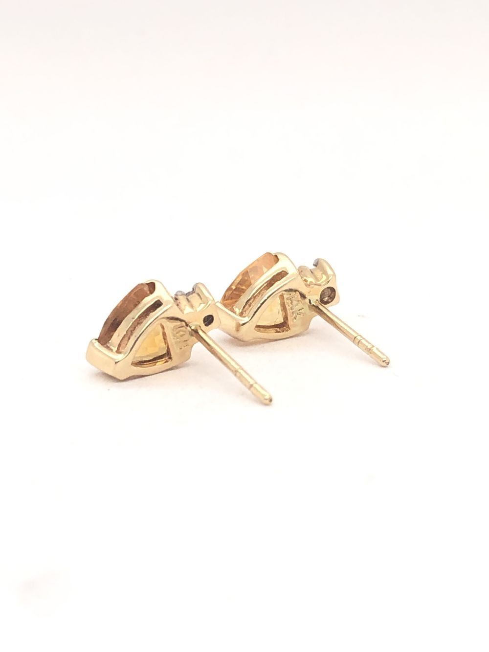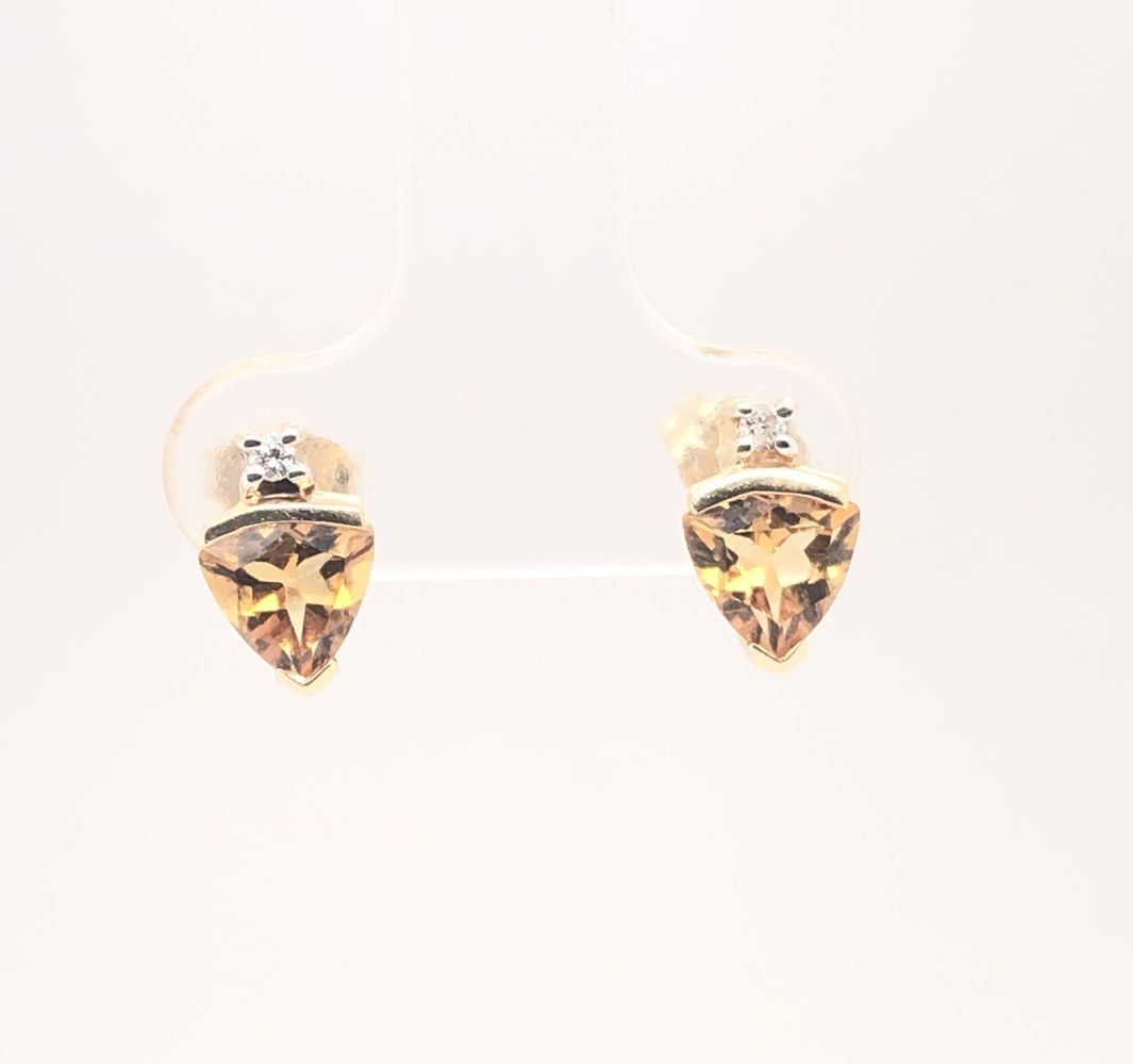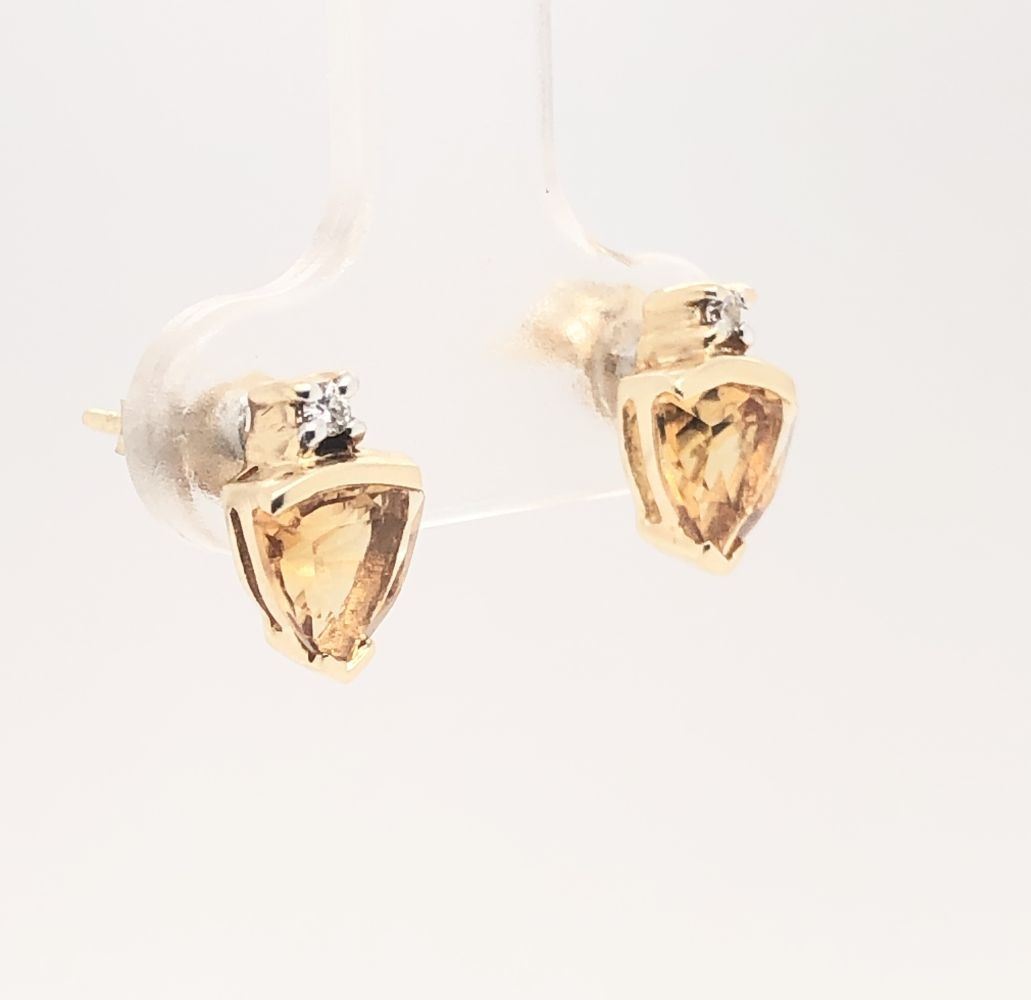Genuine Citrine and Earth-Mined Diamond Earrings.& nbsp; This is a pair of 14 karat yellow gold earrings that feature approximately 1.00 carat of trilliant-cut, semi-bezel set golden citrines with diamond accents.& nbsp; These earrings attach to the earlobe with posts and firm friction backs.& nbsp; They are approximately 1/4& quot; diameter.& nbsp; This is a preowned, estate item in excellent condition.