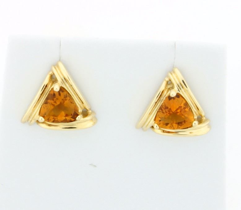 In 14K yellow gold the earrings contain two 7mm trillion cut citrine gemstones with deep yellow color. They come with friction backs.       4.2g