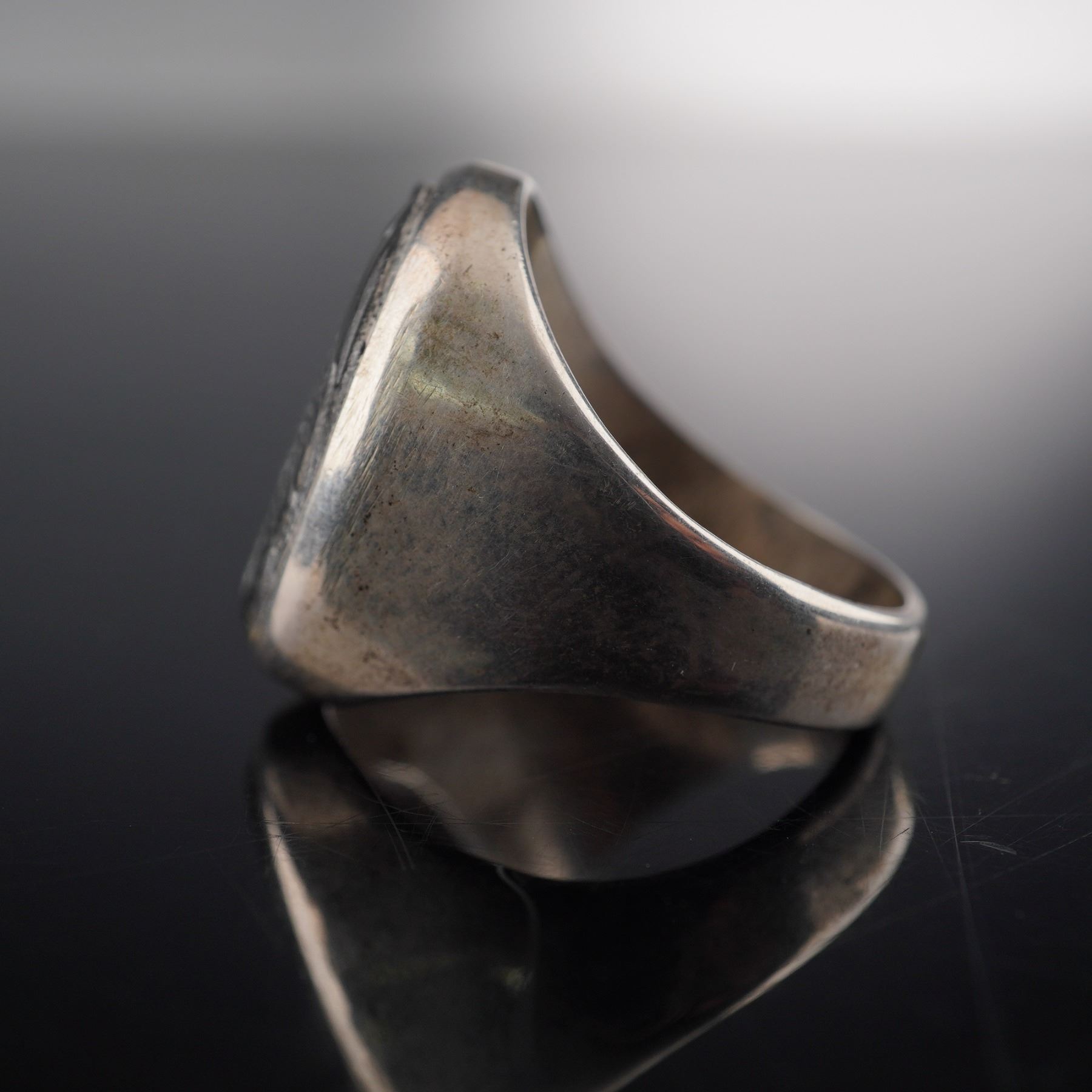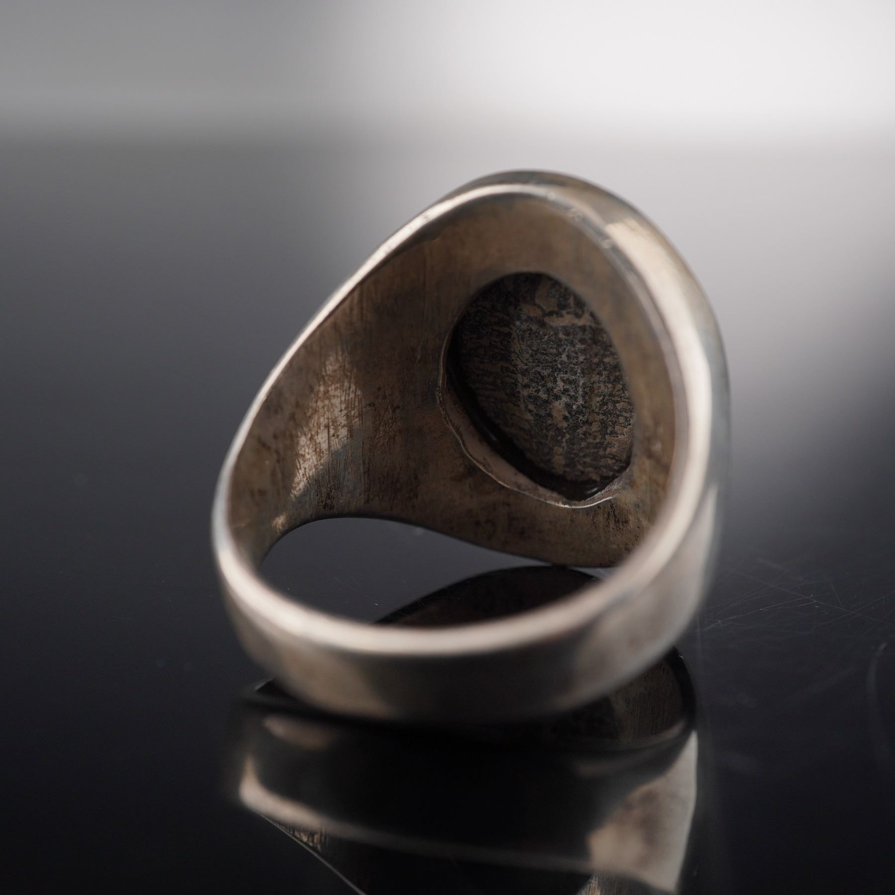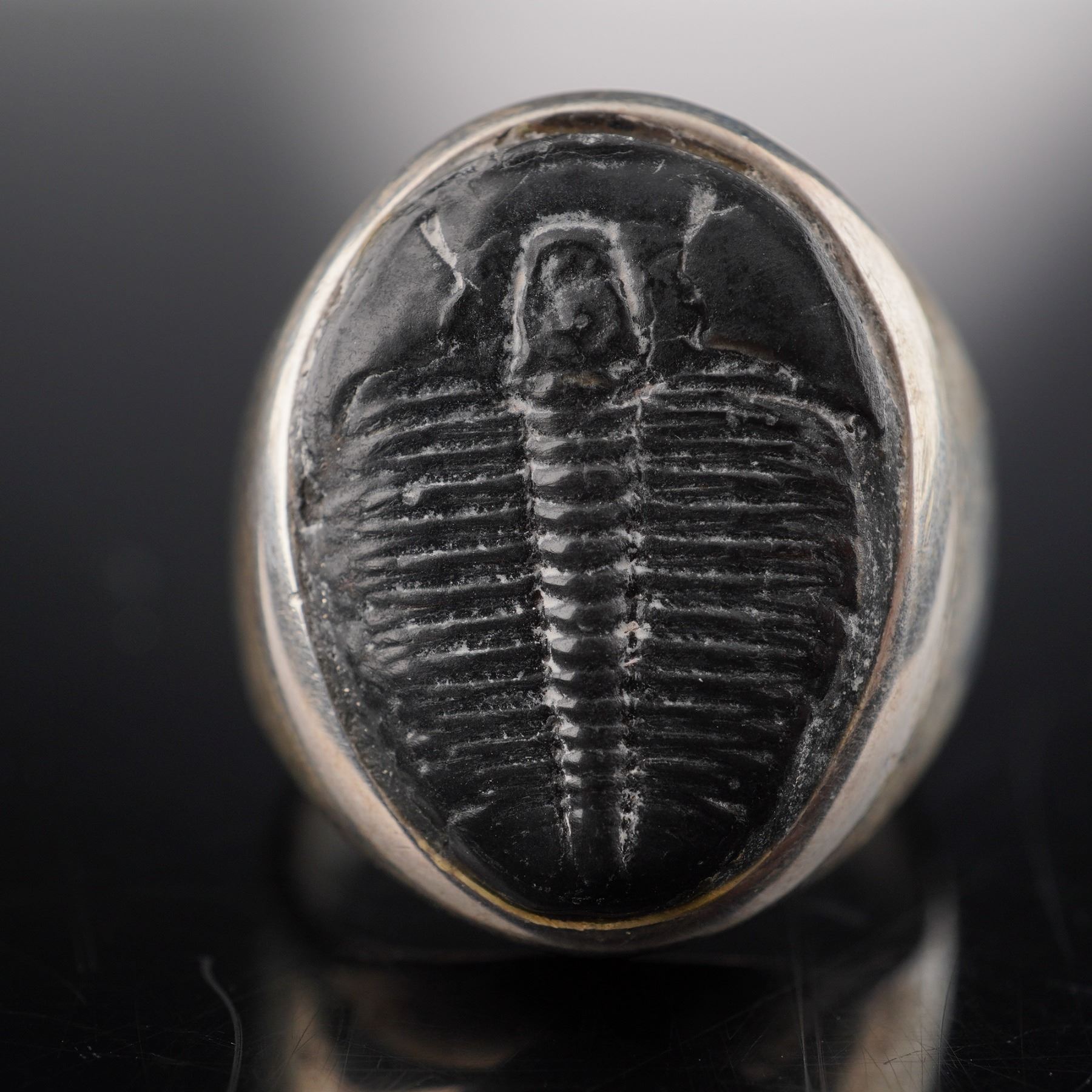 A ring featuring a trilobite fossil or cast specimen mounted in a smooth, tapered silver-toned setting. The piece displays the segmented form characteristic of the extinct marine arthropod, presented within a modern mount designed to highlight the specimen's natural relief. The combination of an ancient subject and later manufacture results in a distinctive piece that bridges geological history and contemporary craftsmanship. Weight: 18.2 g. Estate of Charles H. McCollister, a world traveler known for his connections with notable figures.
