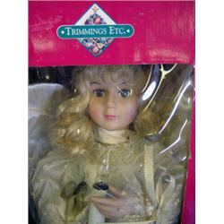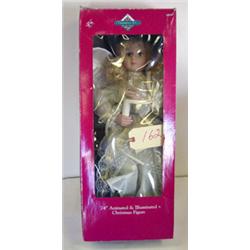 This porcelain angel doll is approximately 24 inches. She is dressed in white and gold and has long blond hair and fixed brown eyes. She is holding a candle. She is an animated and illuminated Christmas figure. She is in her original box and is in excellent condition.
