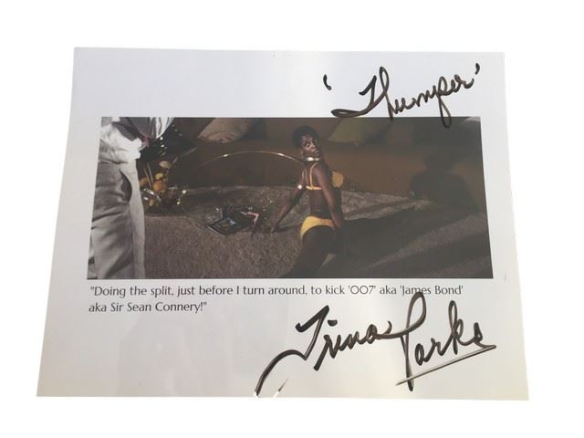 Laminated autographed photo of Trina Parks on the set of "007" doing the splits in a scene with Sean Connery. Trina Parks was the first African American singer and dancer featured in the Palm Springs Follies for 6 years from 2002-2008. (8 1/2"x11)