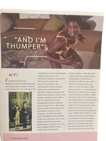 Trina Parks preview to her upcoming book about her life and becoming the first black James Bond Woman/Villain. This is a short story (7 pages) about her nickname in the film "Thumper". Signed by Trina Parks. Trina Parks was the first African American singer and dancer featured in the Palm Springs Follies for 6 years from 2002-2008.