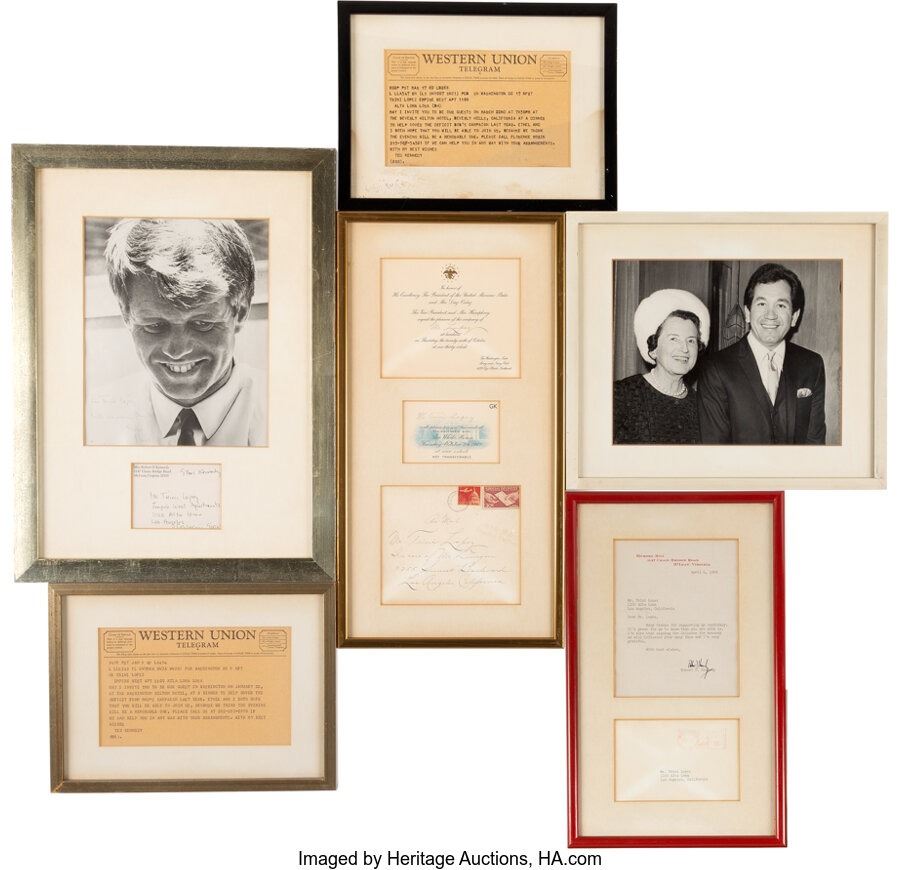 Trini Lopez Correspondence From Ted, Robert, and Ethel Kennedy With White House Invitation. Five framed items, featuring correspondence sent to Trini. Includes: 1)Two Western Union telegrams from 1969 from Ted. The one dated in March (inviting Trini to the Beverly Hilton Hotel) is matted and framed to an overall 11 ¼" x 8 ½". Matte has soiling in various spots while the telegram is overall toned. In Very Good condition. The one dated in January (inviting Trini to the Washington Hilton Hotel) is matted and framed to an overall 11 ¼" x 8 ½". In Very Good Plus condition; 2)A black and white photo of Trini with Lady Bird Johnson. Matted and framed to an overall 13" x 11". In Near Mint condition; 3)A signed letter from Robert F. Kennedy (matted with the original envelope), thanking him for his support. Dated April 4, 1968. Matted and framed to an overall 9" x 14 ½". Signed with a thin black felt tip. Note has a a large fold mark through the center. Envelope has toning. Overall, in Very Good condition; 4)A black and white photo of Robert signed and inscribed by his wife, Ethel. Matted with the original envelope. Framed to an overall 12 ¾" x 17 ¼". Signed and inscribed with a ballpoint pen. Overall, in Very Good condition with light chipping and wear on the frame; 5)An invitation to the White House with its original envelope. Invitation to luncheon as a guest of Hubert Humphrey and his wife on Thursday, October 26, 1967. Matted and framed to an overall 9 ¼" x 17 ½". In Very Good condition with several spots of toning on the frame and cover. COA from Heritage Auctions.