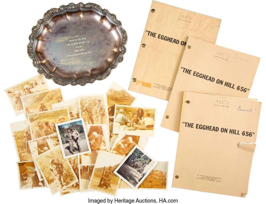 Trini Lopez "Egghead on Hill 656"/The Reluctant HeroesScripts (3) With Photos (22) and Tray. Released in 1971 on ABC, the TV movie was called The Reluctant Heroes, but it was originally titled "Egghead on Hill 656." Includes: 1)These three scripts are listed as "First Revised Rewrite" and dated March 17, 1971. One version (with plenty of writing on it) has the shooting schedule added at the end, while the other two just have the script. Overall, in Very Good condition with some tears on covers; 2)A collection of 20 sepia-toned photographs and two color photographs from the set of the film. Overall, in Very Good Plus condition; 3)A tray with the following engraved: "ABC / Movie-Of-The-Week / ‘The Egghead On Hill 656' / Starring / Trini Lopez / Aaron Spelling Productions 1971." Measures 11 ¾" across. Heavily toned. In Very Good condition. COA from Heritage Auctions.