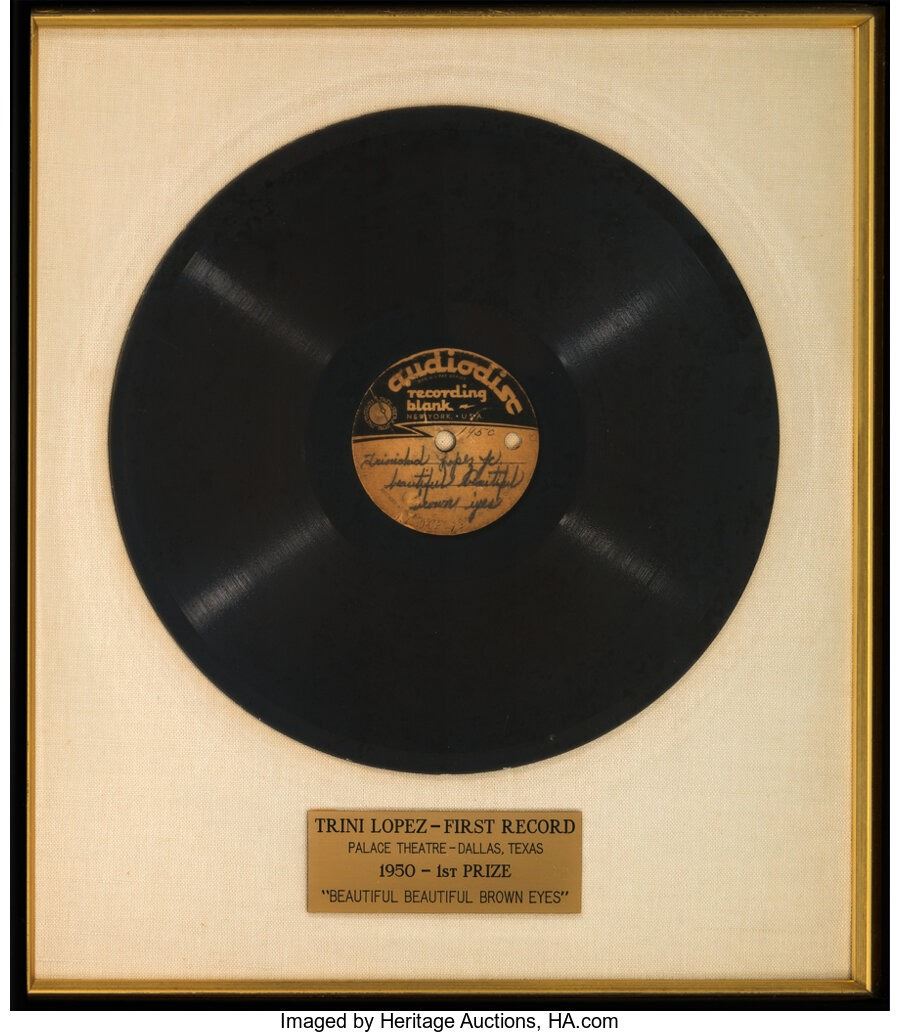 Trini Lopez First Record 78 RPM Acetate Matted and Framed. Placed on white matte and framed to an overall 14 ¼" x 16 ¼", this 78 RPM acetate is listed as Trini's first record. According to the plaque in the bottom center portion, "Trini Lopez – First Record / Palace Theatre – Dallas, Texas / 1950 – 1st Prize / ‘Beautiful Beautiful Brown Eyes.'" Label on record has considerable toning. Disc measures 10" in diameter. Overall, disc is in EX 7. Frame is in Very Good Plus condition with light wear in various spots. COA from Heritage Auctions.