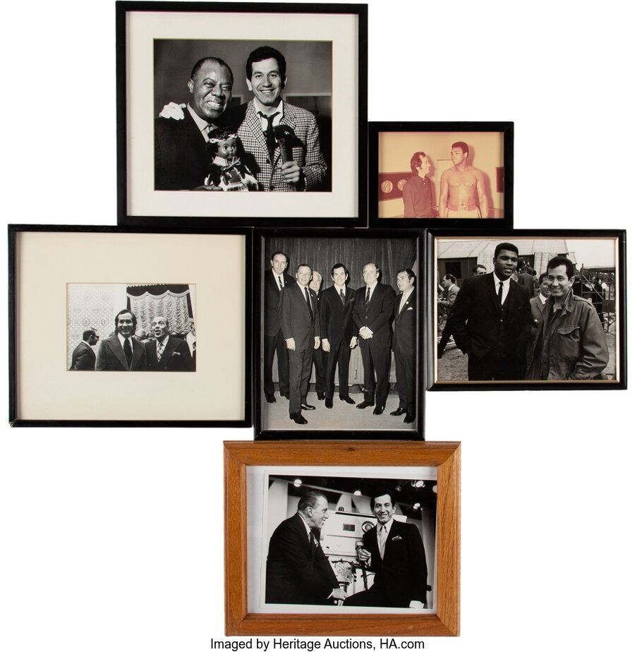 Trini Lopez Framed Photos With Ed Sullivan, Muhammed Ali, Frank Sinatra, Louis Armstrong, and Hubert Humphrey. A collection of six framed photos of various sizes of Trini with legends of music, TV, and sports. Sizes range from 5 ¼" x 7 ¼" to 12 ½" x 11 ¼". Overall, in Very Good Plus condition with some wear and chipping on the frames.
