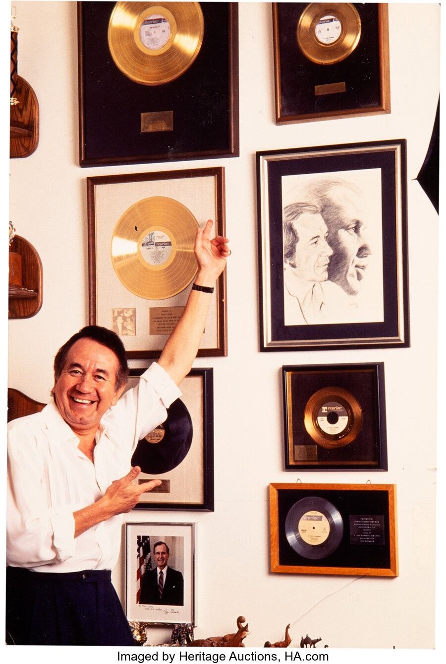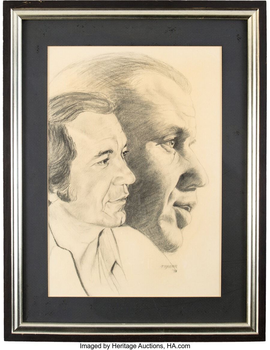 Trini Lopez/Frank Sinatra Personally Owned Limited Original Pencil Drawing. Matted and framed to an overall 17 ¼" x 22 ½", this original pencil drawing of Trini and Ol' Blue Eyes is from 1978. Comes with a color photo of Trini showing off the drawing. In Very Good condition with chipping on the frame and loose backing tape. COA from Heritage Auctions.
