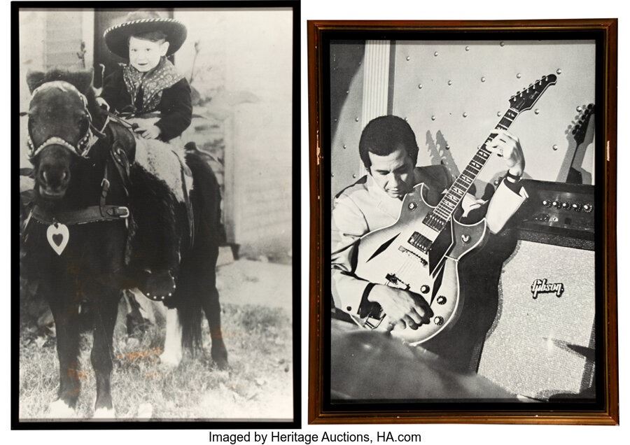 Trini Lopez Large Black and White Photo Prints (2). Lot includes: 1)A print of Trini at two years old, dressed in cowboy attire and sitting on a pony. Measures to an overall 25" x 37". In Very Good Plus condition with chipping on the frame; 2)A print of Trini with his Gibson signature guitar. Framed to an overall 21" x 27 ½". In Very Good condition with various chippings on the frame. COA from Heritage Auctions.